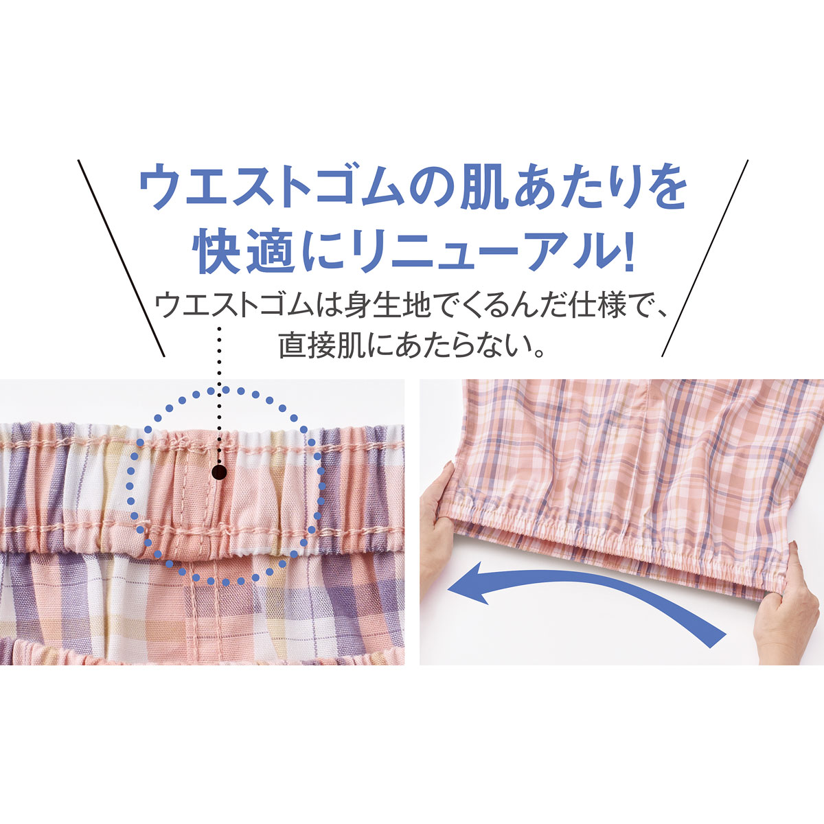 ウエストゴムの肌あたりを快適にリニューアル!ウエストゴムは身生地でくるんだ仕様で、直接肌にあたらない。