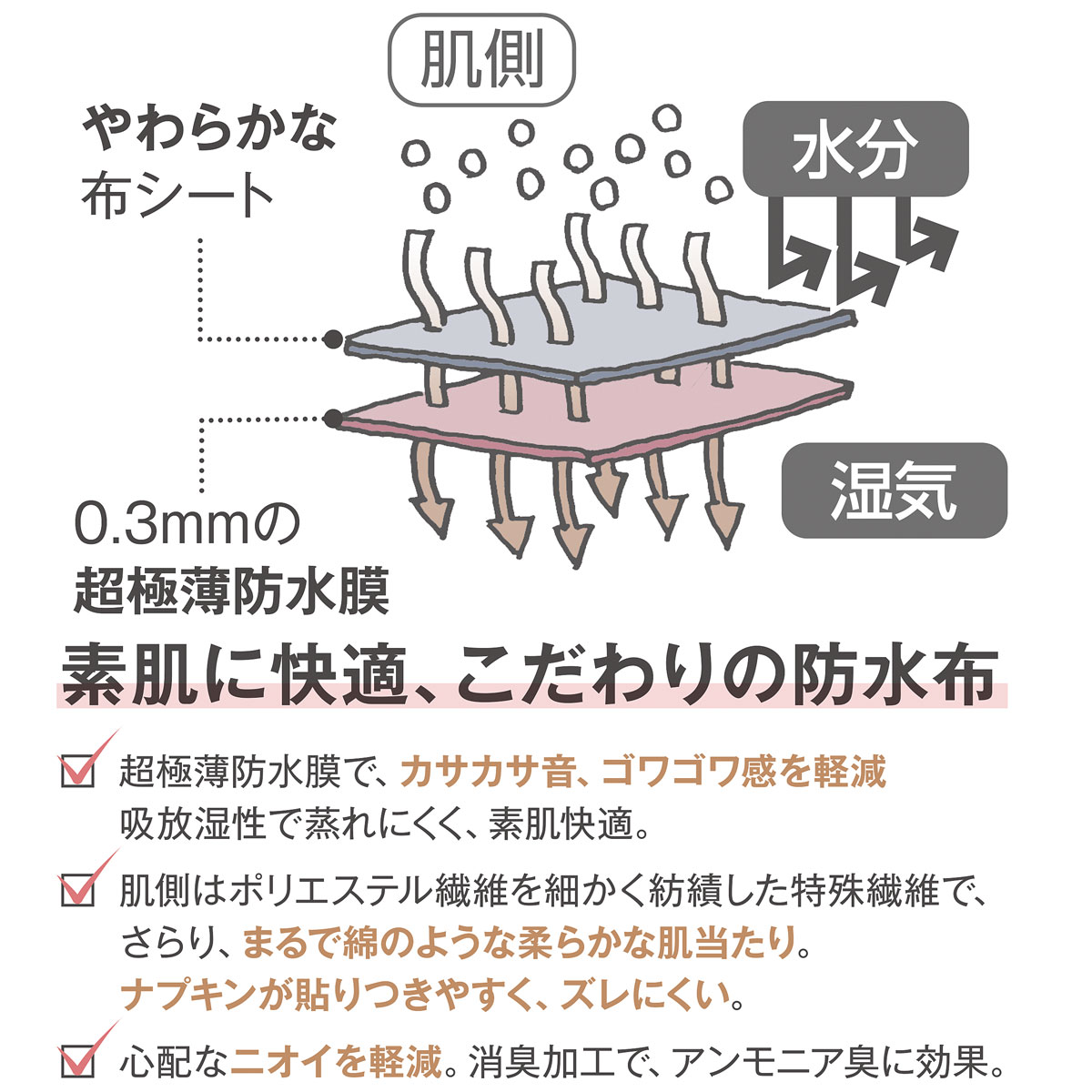 前後に長い防水布 長時間の座り仕事や、前側にモレやすい人にも安心。フロントパネルと、マチ~後ろセンターゴムでナプキンを身体にフィット。つたいモレの不安軽減。