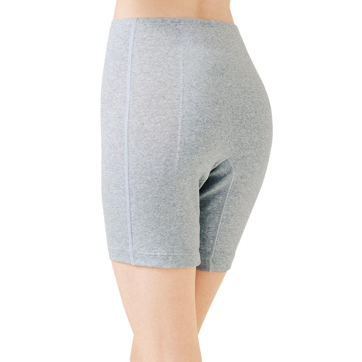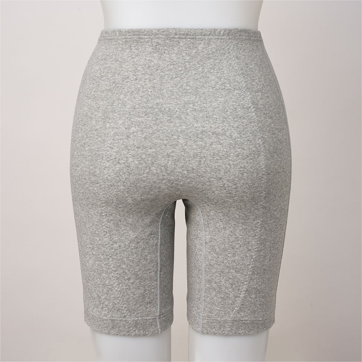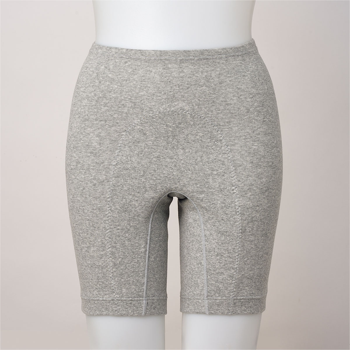 B(グレー杢) 1分丈タイプ (1)お腹まわり快適締め付けにくい やわらかなゴムを内蔵。(2)洗濯表示は身生地にプリント。(3)1分丈もロング丈も羽根付きナプキン対応
