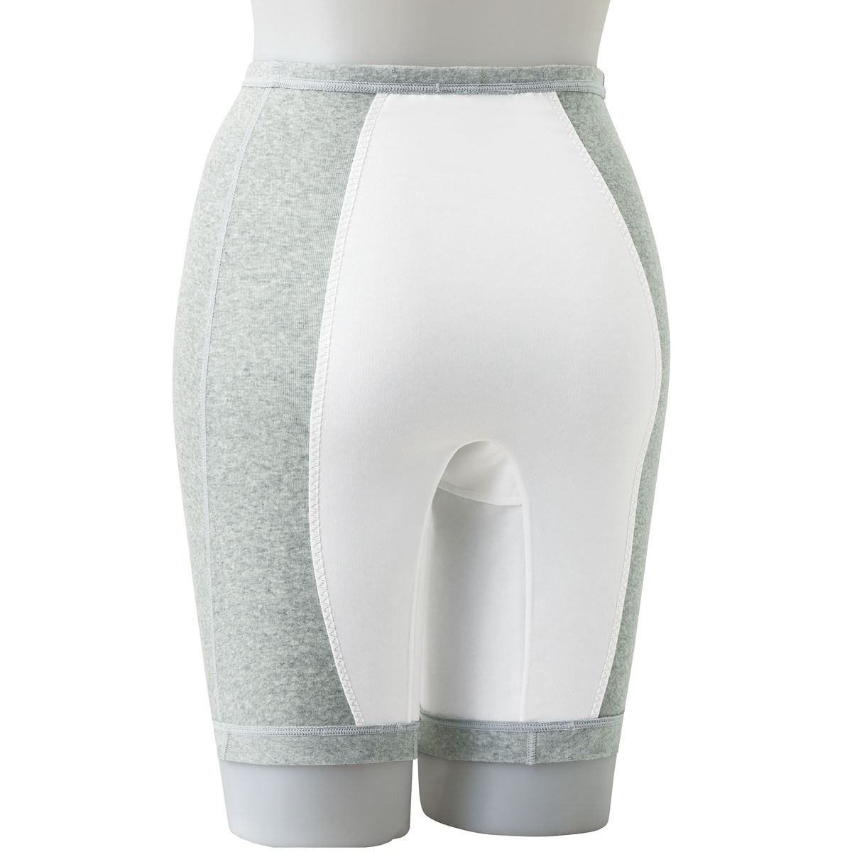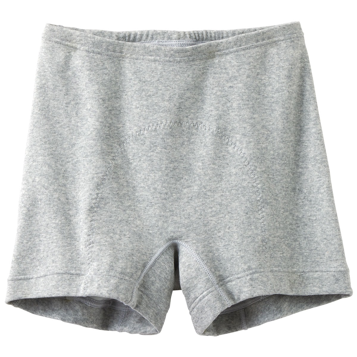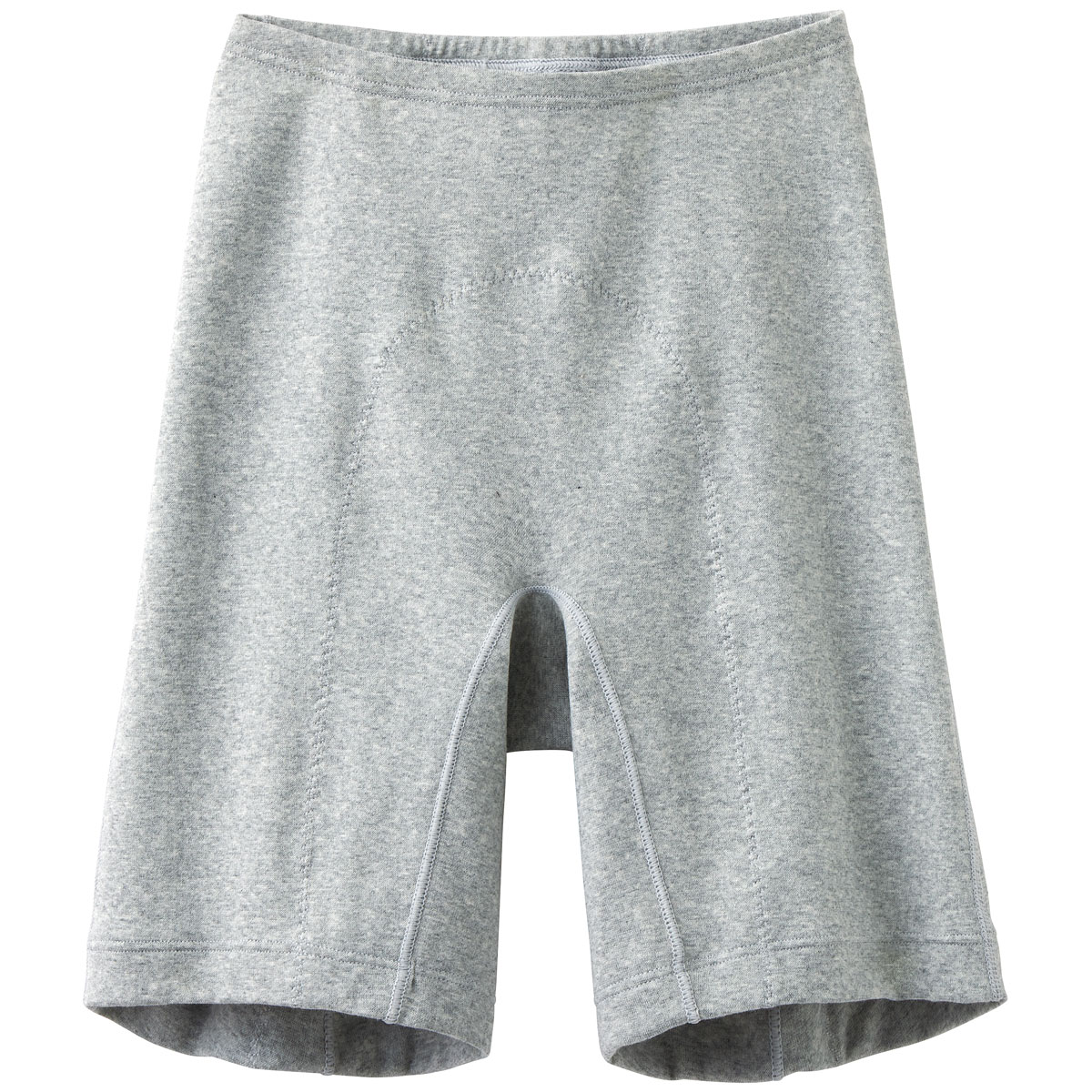 B(グレー杢) 1分丈タイプ (1)お腹まわり快適締め付けにくい やわらかなゴムを内蔵。(2)洗濯表示は身生地にプリント。(3)1分丈もロング丈も羽根付きナプキン対応