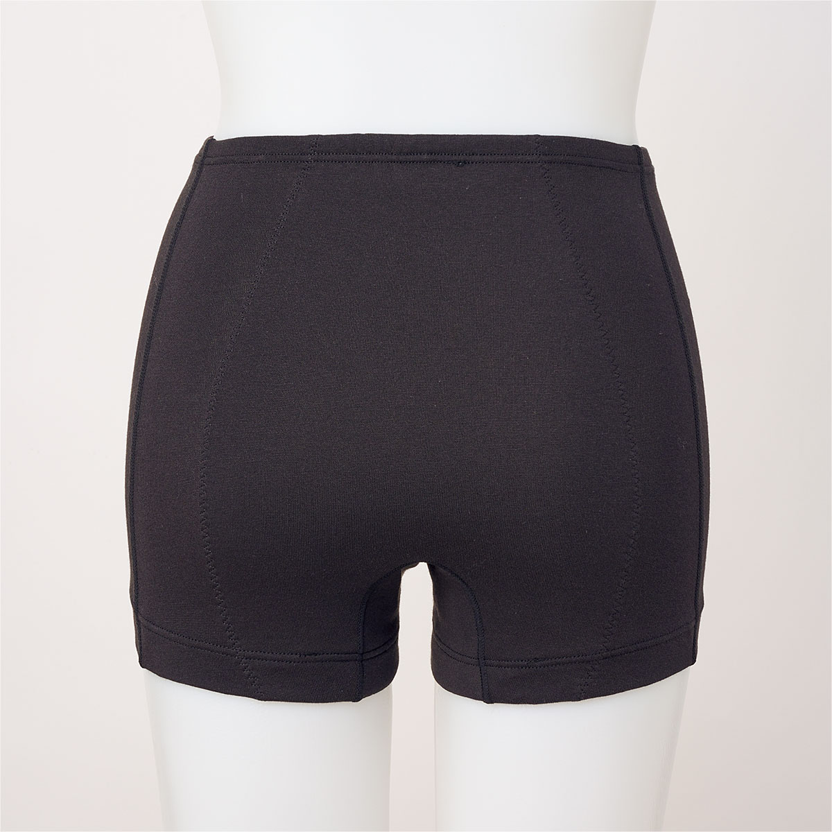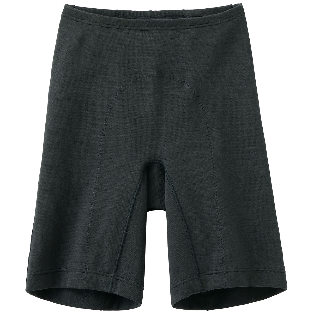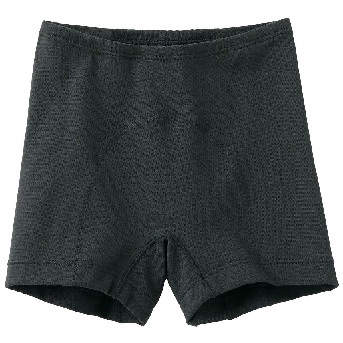 C(ブラック) ロング丈タイプ (1)お腹まわり快適締め付けにくい やわらかなゴムを内蔵。(2)洗濯表示は身生地にプリント。(3)1分丈もロング丈も羽根付きナプキン対応