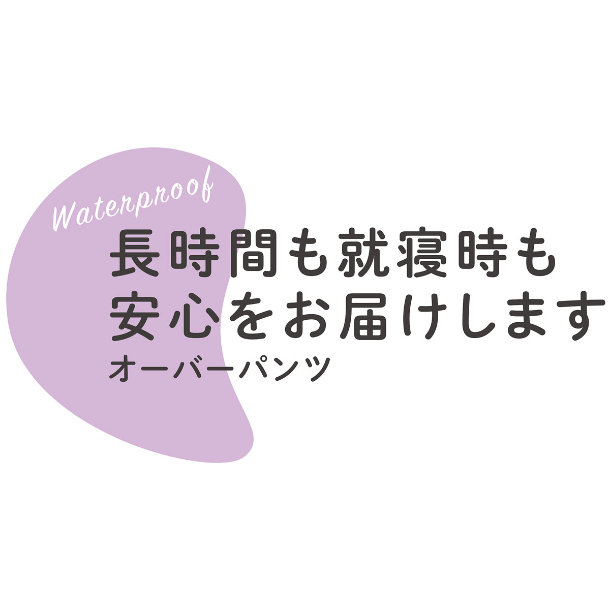 前後に防水布を大きく配置した、サニタリーオーバーパンツ。防水布の縫い目部分からのモレを防ぐため内股部分の防水布と身生地を独立し、縫製部分には透明防水テープを貼って二重にブロック。綿混ストレッチ素材&ウエスト折り返し仕様で締め付けにくいのもポイント。ニオイが気になりにくい消臭加工済み。やわらかくてゴワゴワせず、カサカサ音がしにくい、こだわりの防水布を使用。大きいサイズ・小さいサイズも展開(S~5L)
