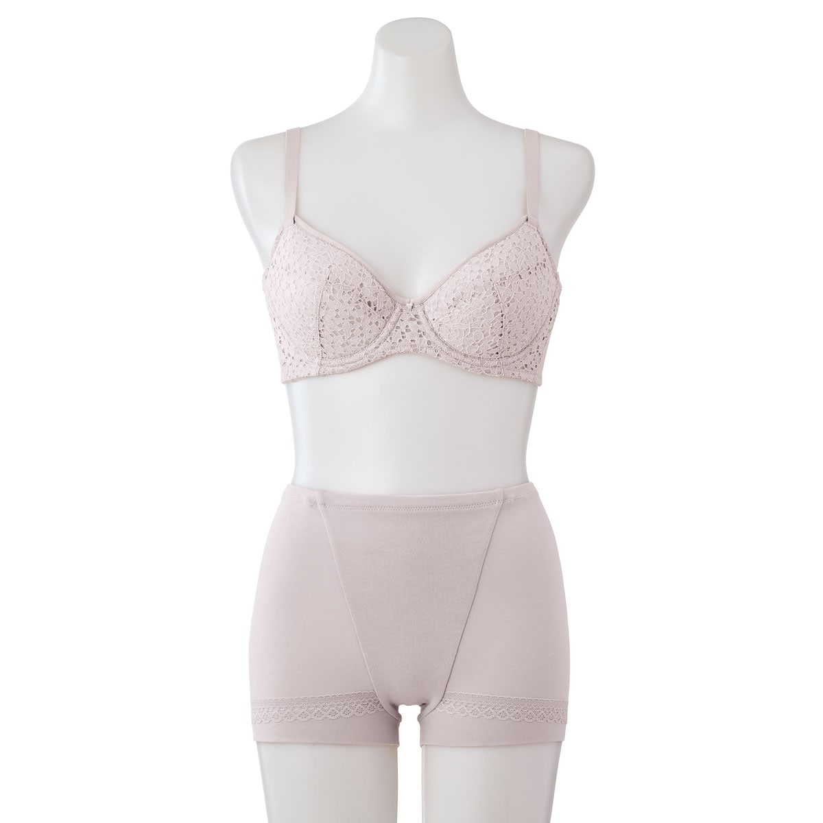 肌にあたる部分は綿混素材にこだわった、肌にやさしいショーツ。マチ部分の縫い目やゴムが肌にあたらない仕様で、マチ足口はゴロつかない袋縫いにしたやさしさ仕上げ。さり気ないレースがかわいいシンプルなデザインで、すっぽり包み込む形がうれしい♪コットンショーツ派の方にもおすすめ。同色のTシャツみたいなブラ®(BA-650/BA-751/BS-579)とコーデができます。