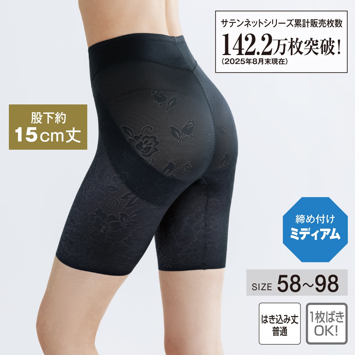 サテンネットシリーズ累計販売枚数136.8万枚突破!(2023年9月現在)愛され続ける美シルエット®が叶う美尻ガードル股下約15cmタイプ。ウエストレースなしタイプでレースが苦手な方におすすめ♪