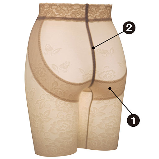 (1)パワーネットの裏当てがヒップをシェイプ。(2)バックギャザーで丸みをつぶさず立体的なヒップをメイク。