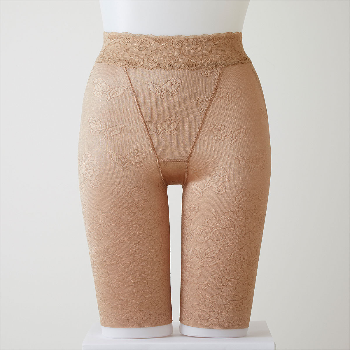 ウエストはゴム不使用。ストレッチレースとパワーネットで、くい込みにくくラク。 ローズベージュ着用例 フロントスタイル