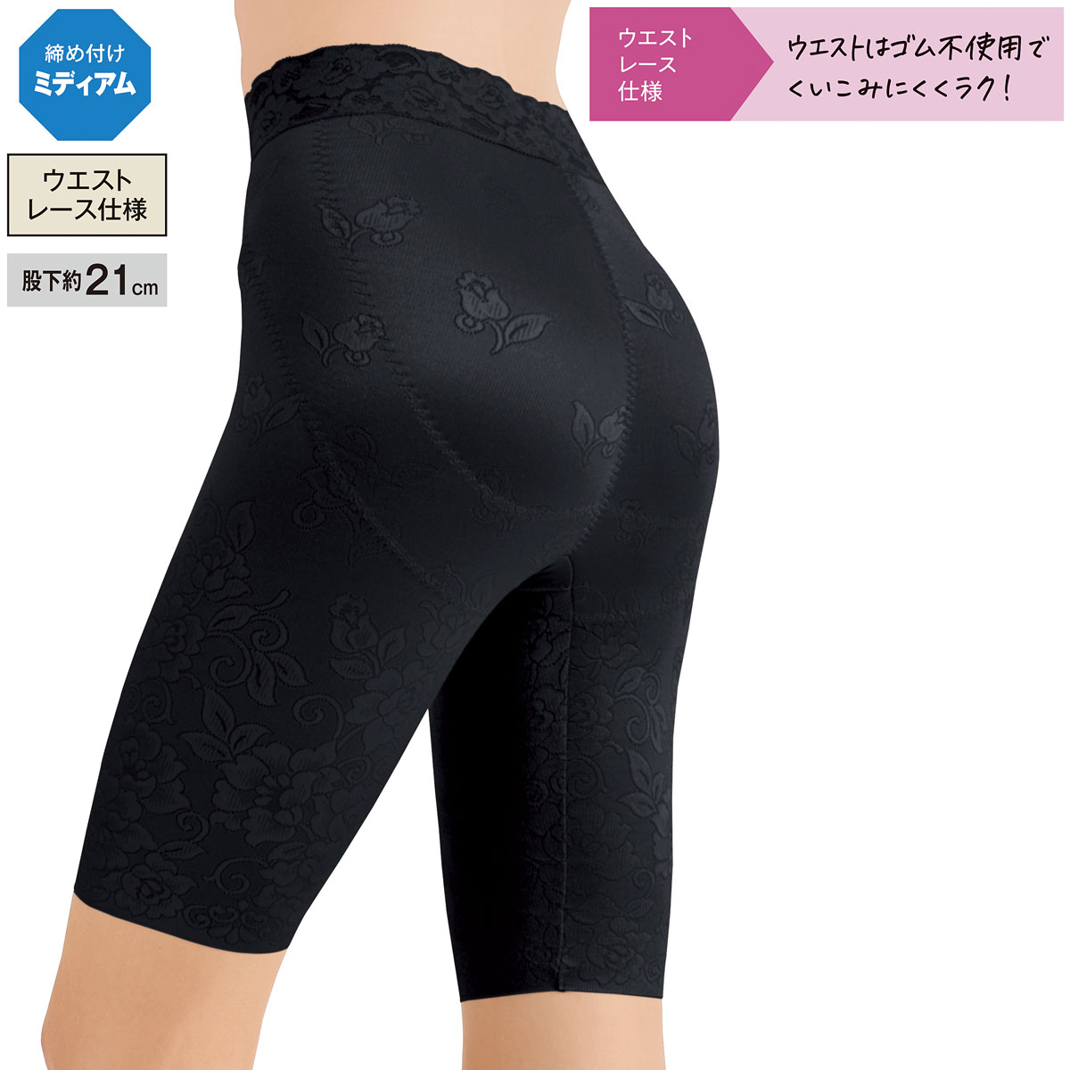 ウエストレース仕様ウエストはゴムを使わず、パワーネットとストレッチレースの二重仕立てでやさしくフィットして、くい込みにくくラクな着心地。