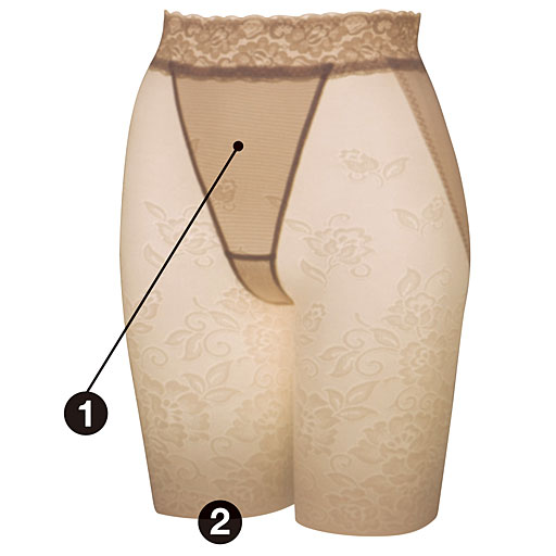 (1)パワーネットの裏当てがおなかをシェイプ。(2)足口ヘム仕上げでアウターにひびきにくい。