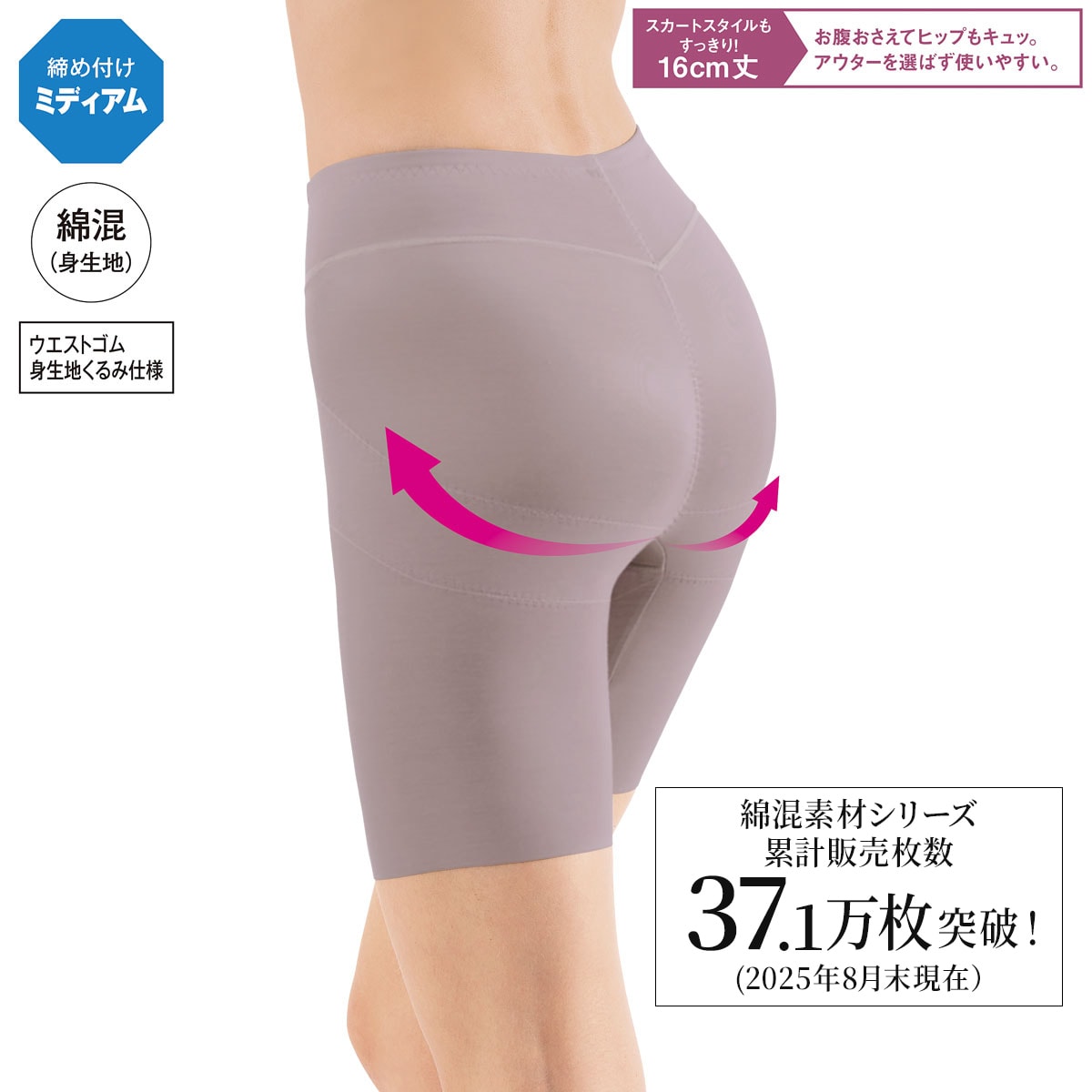 肌あたりやさしい綿混素材で、ゆるんだヒップライン&シルエットをすっきり整えます。ローズグレー 股下約16cm 着用例