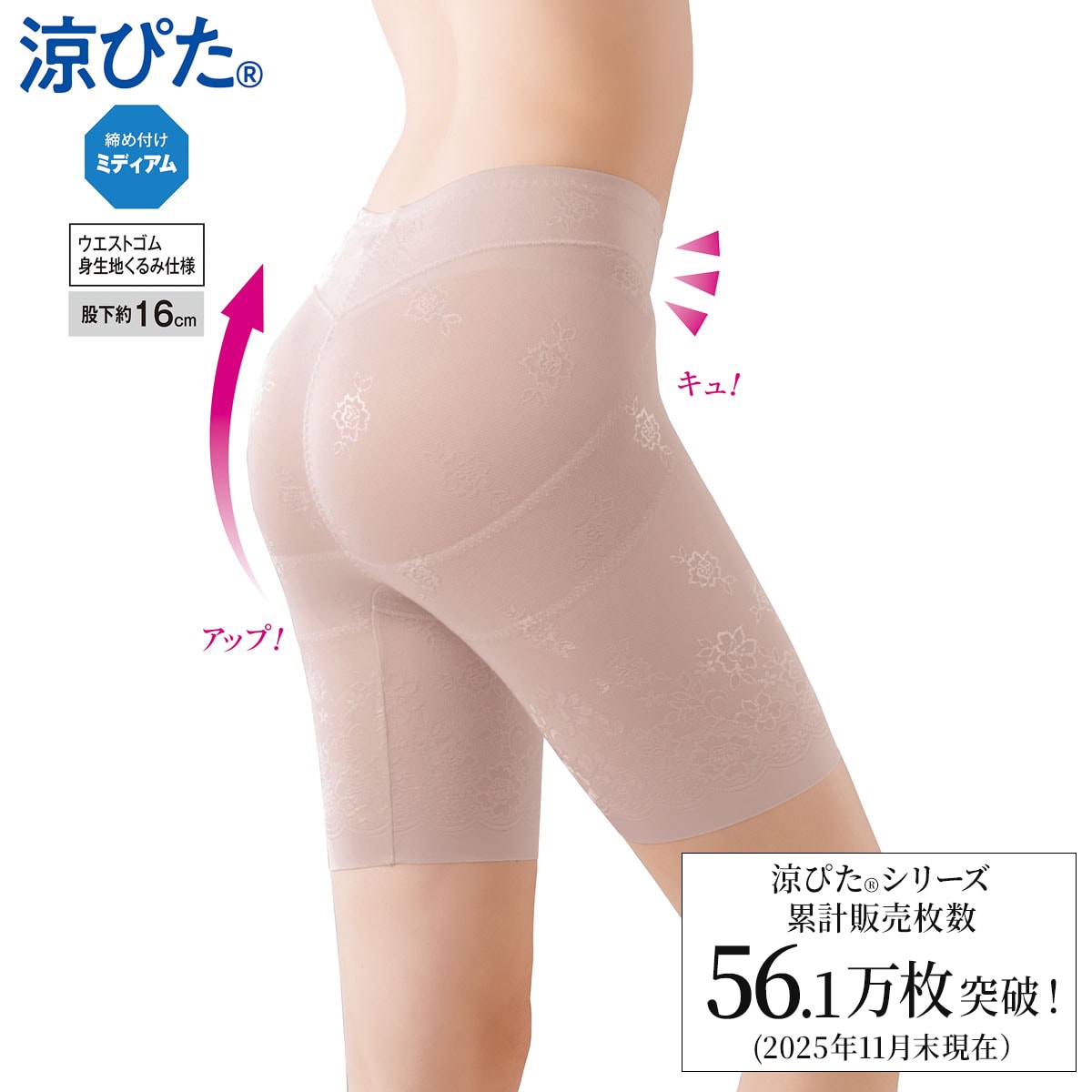 (ミディアムタイプ・股下約16cm・ウエストゴム身生地くるみ仕様)。吸汗速乾メッシュ素材で年中涼しくボディメイク!ウエストも足口もぴたっときれいにフィットしてひびきにくい。