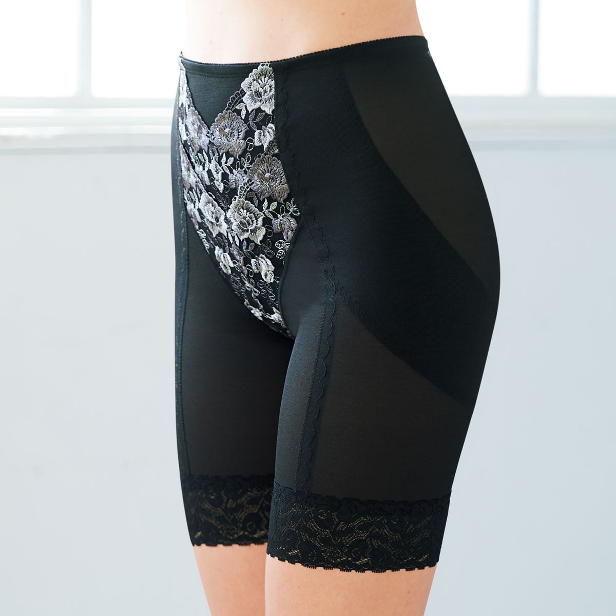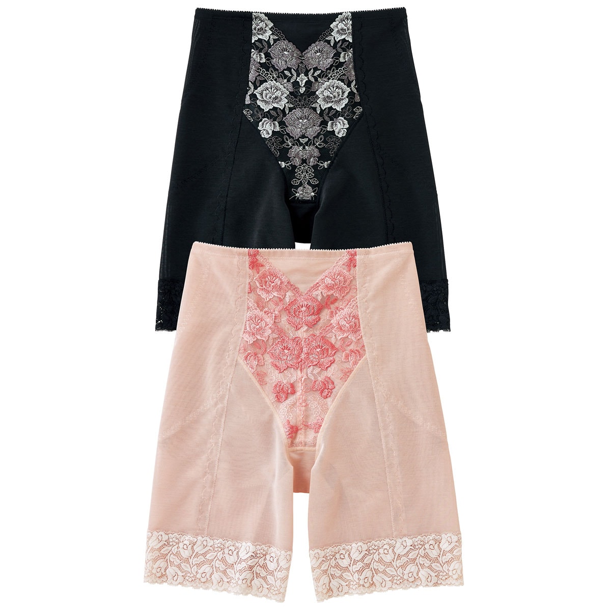 パワフルに引き締めてすっきりしたヒップラインを演出する、ハードタイプのロングガードル(色違い2枚組)。花柄レースをあしらったフェミニンなデザイン。締め付けハードなガードルをお探しの方におすすめです。