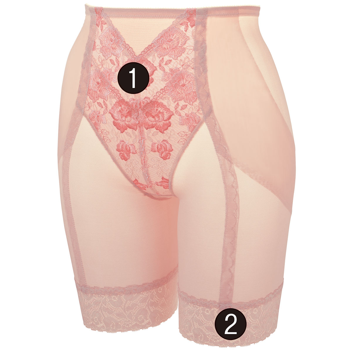 (1)裏当てを付け、おなかをしっかり引き締めます。(2)足口にはレースを使用し、アウターにひびきにくく締め付け感を軽減。