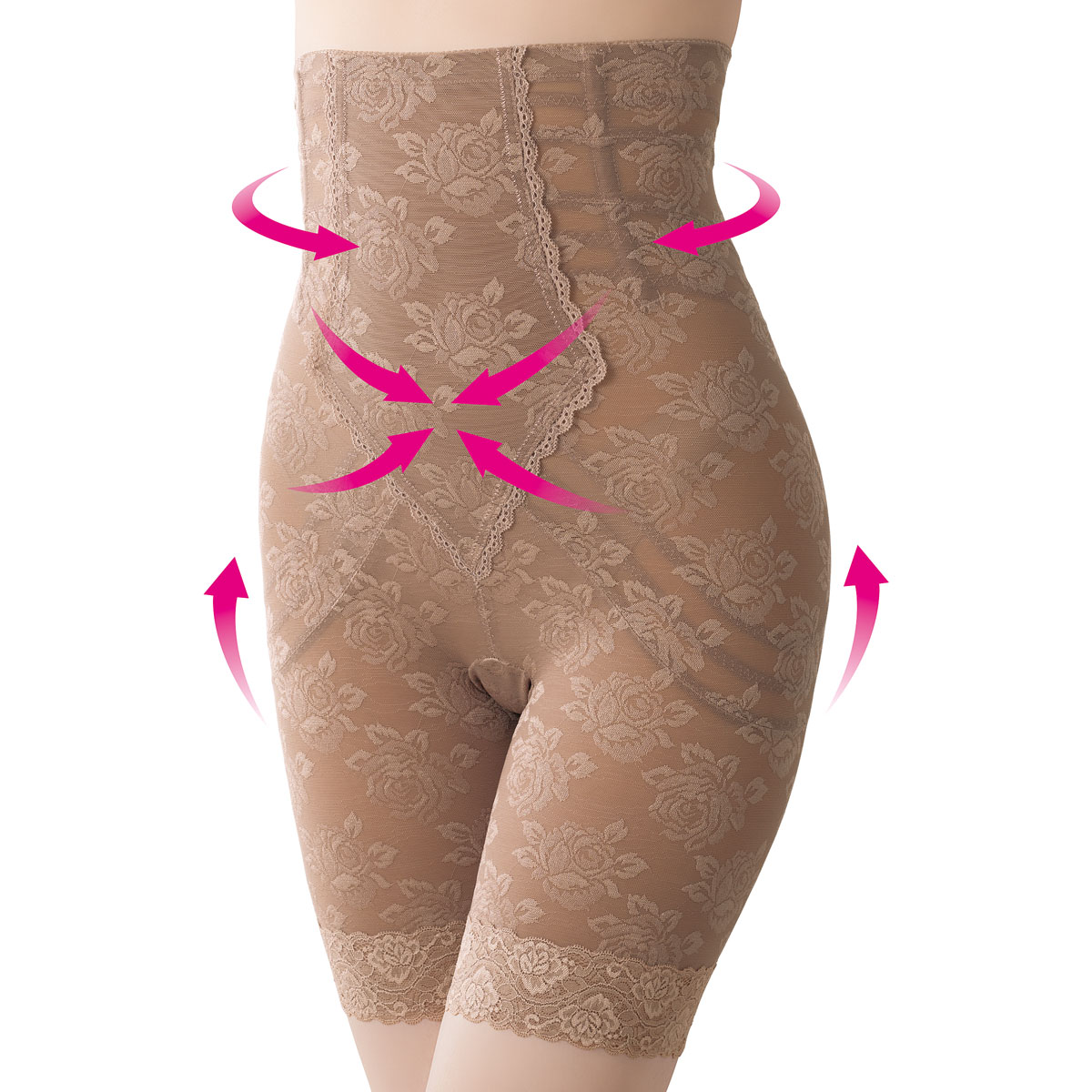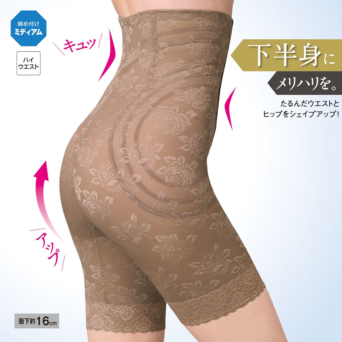 気になる部分をすっぽり包み込んでたるみ・ゆるみをキュッとシェイプ!ハイウエストタイプだから、無防備なウエストまわりや下腹まで1枚でしっかりカバーします。