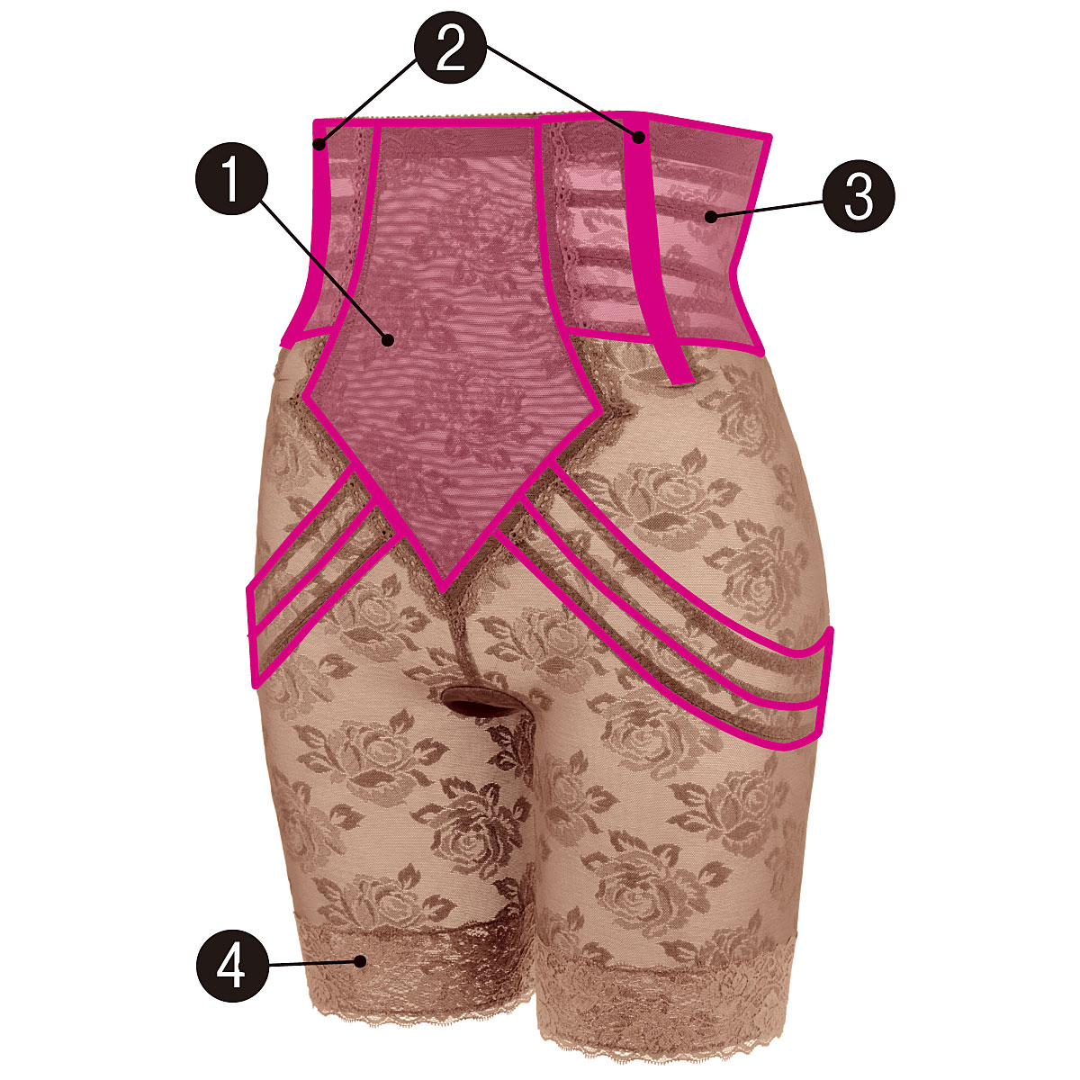 ヒップアップとお腹シェイプで下半身にメリハリ! ①ダイヤ型の縮小パネルでお腹をしっかりシェイプ。②4本のCZボーンで、めくれずスッキリ。③ウエスト周りもぐるっとシェイプ。④足口は締め付けないストレッチレース仕様。