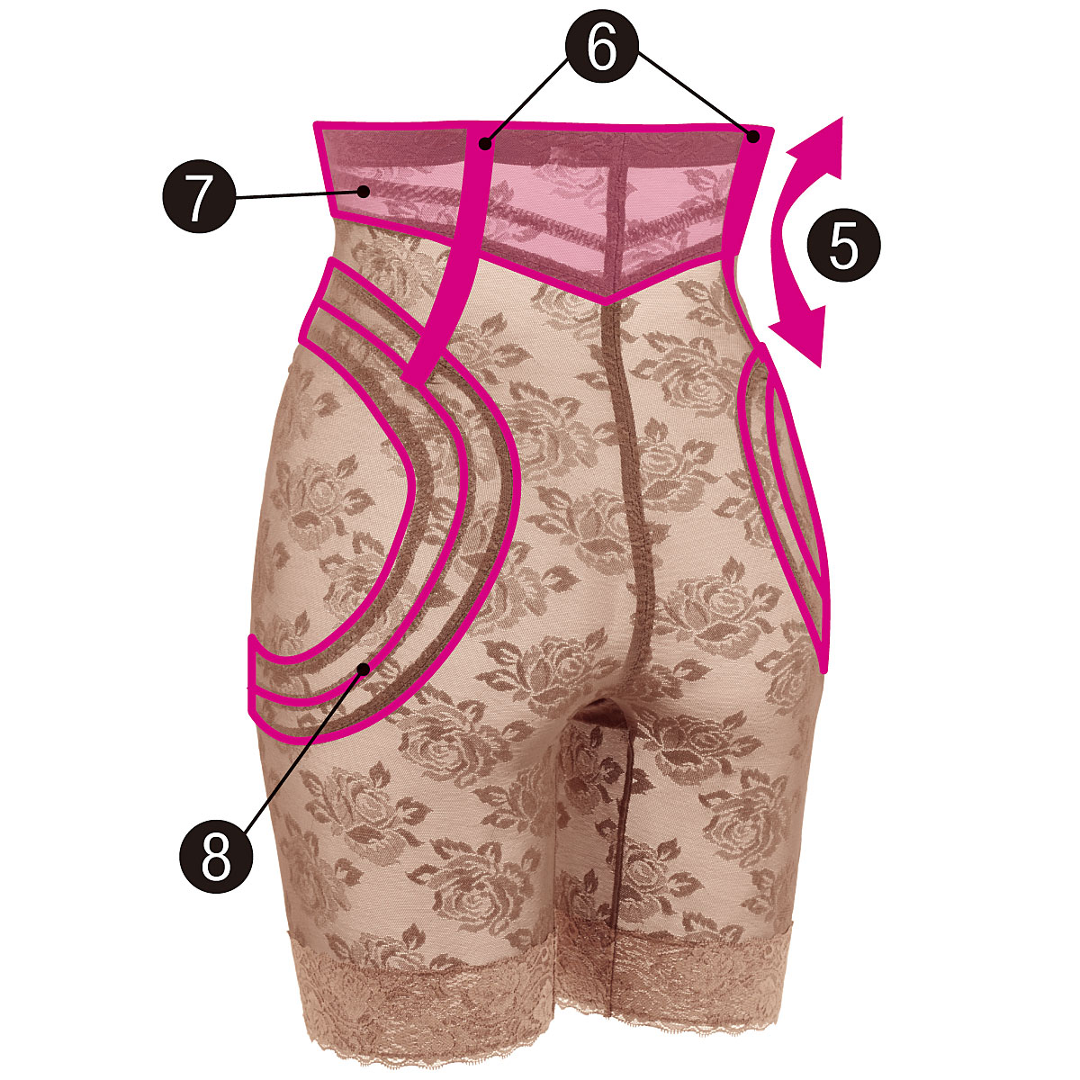 (5)ハイウエスト丈で広くお腹をカバー。(6)4本のCZボーンで、めくれずスッキリ。(7)ウエスト周りもぐるっとシェイプ。(8)立体パターンと渦巻テープでヒップの自然な丸みをキープ。