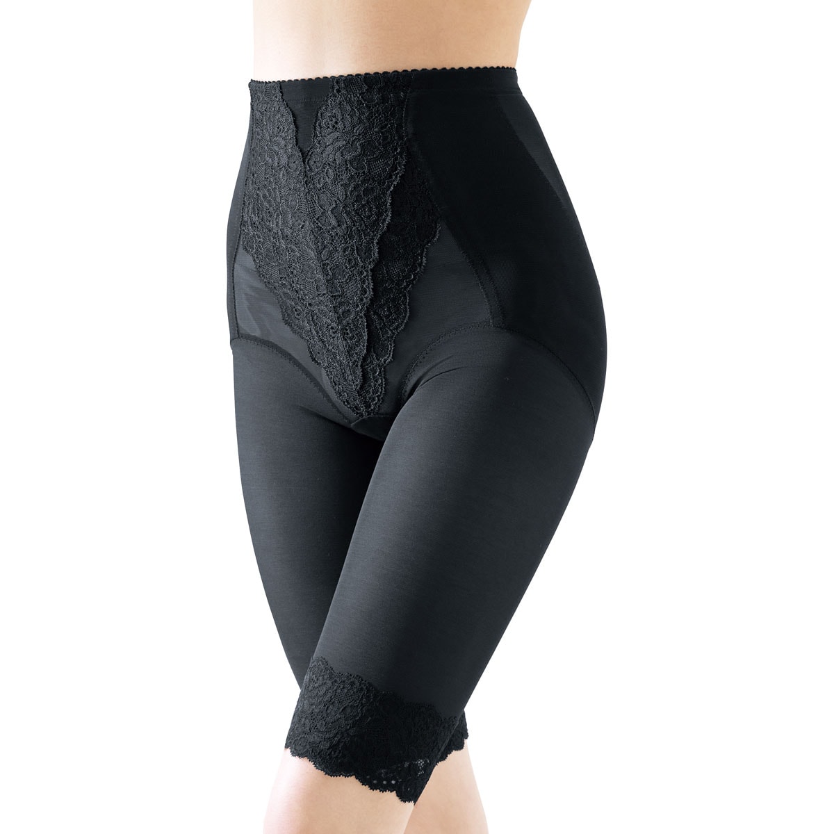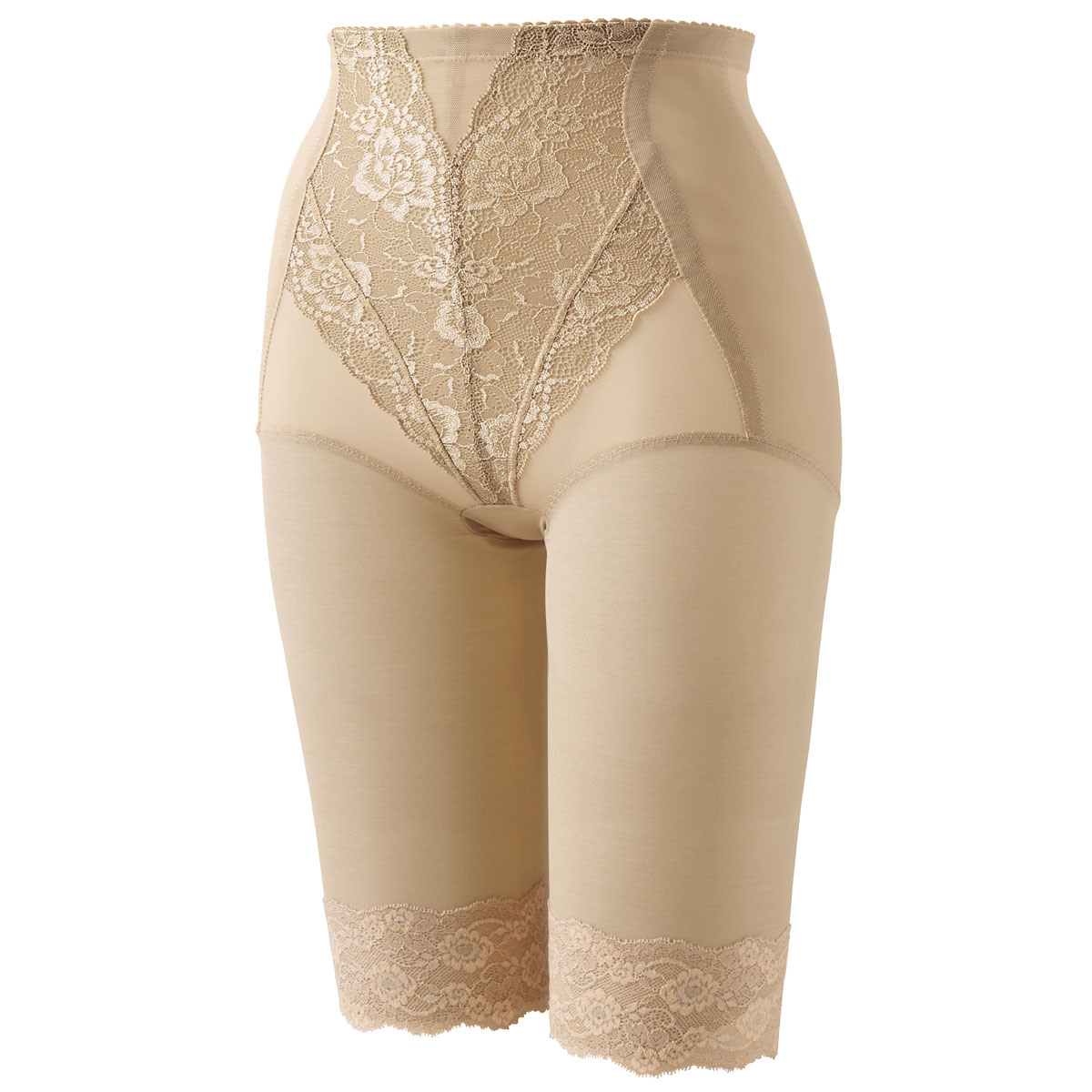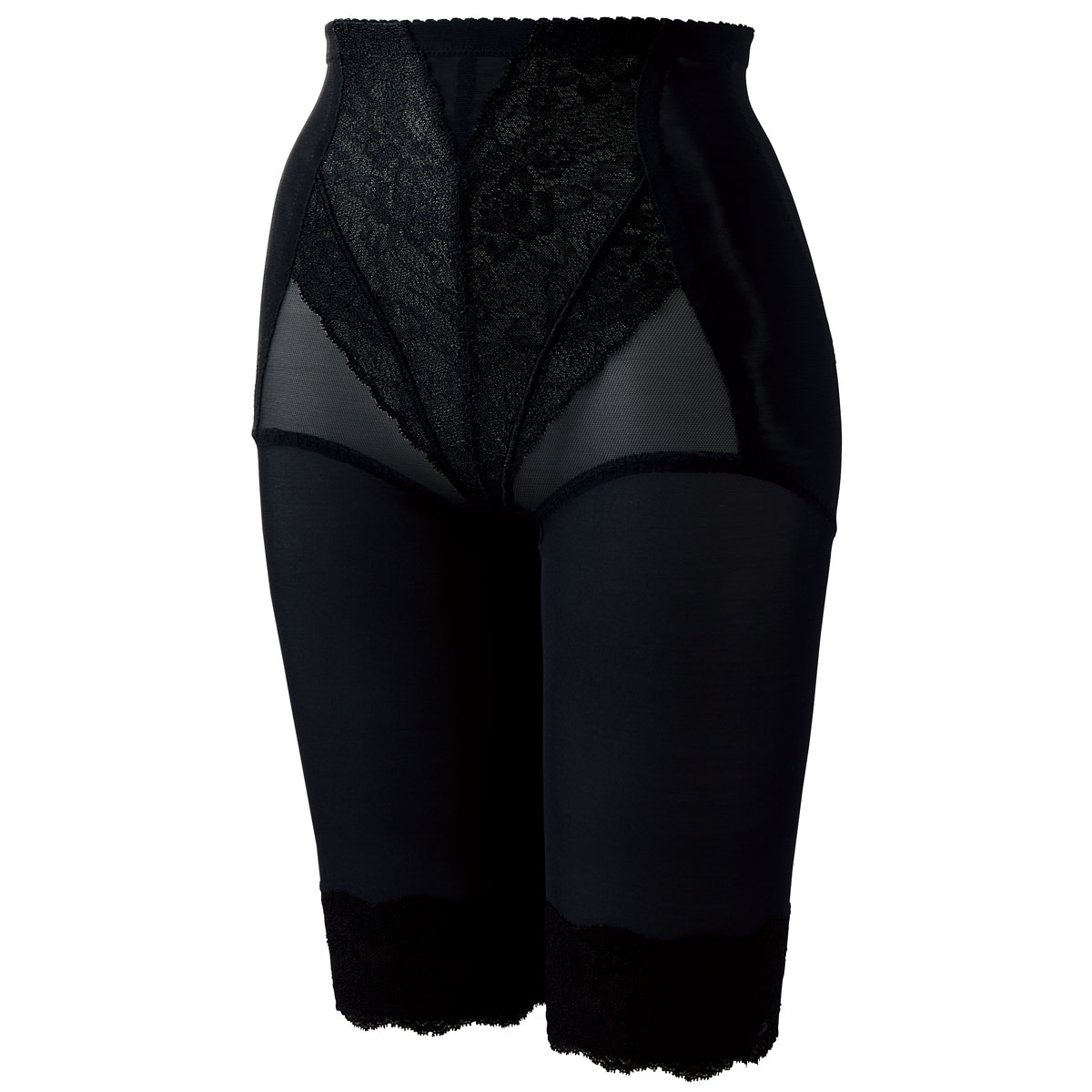 むっちり太もも全体をしっかり引き締めて、アウター映えのするすっきりしたやせ見えシルエットに補整する締め付けハードタイプのロングガードル。ぽっこりお腹もしっかりおさえて、お尻は立体パターンで丸みをつぶさず、ワイドな裏当てでキュッとヒップアップ。足口レース+裏当てで、すっきりひざ上カバー。マチ裏綿混素材で一枚ばきOKです。