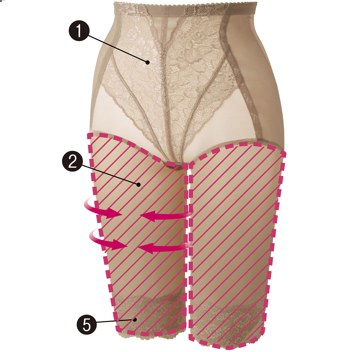 ①お腹部分はしっかり押さえて、気になるぽっこり下腹もすっきり ②ハードな素材で太もも全体をがっちり補整 ⑤前足口はレース+裏当てで、ひざ上のお肉をサポート