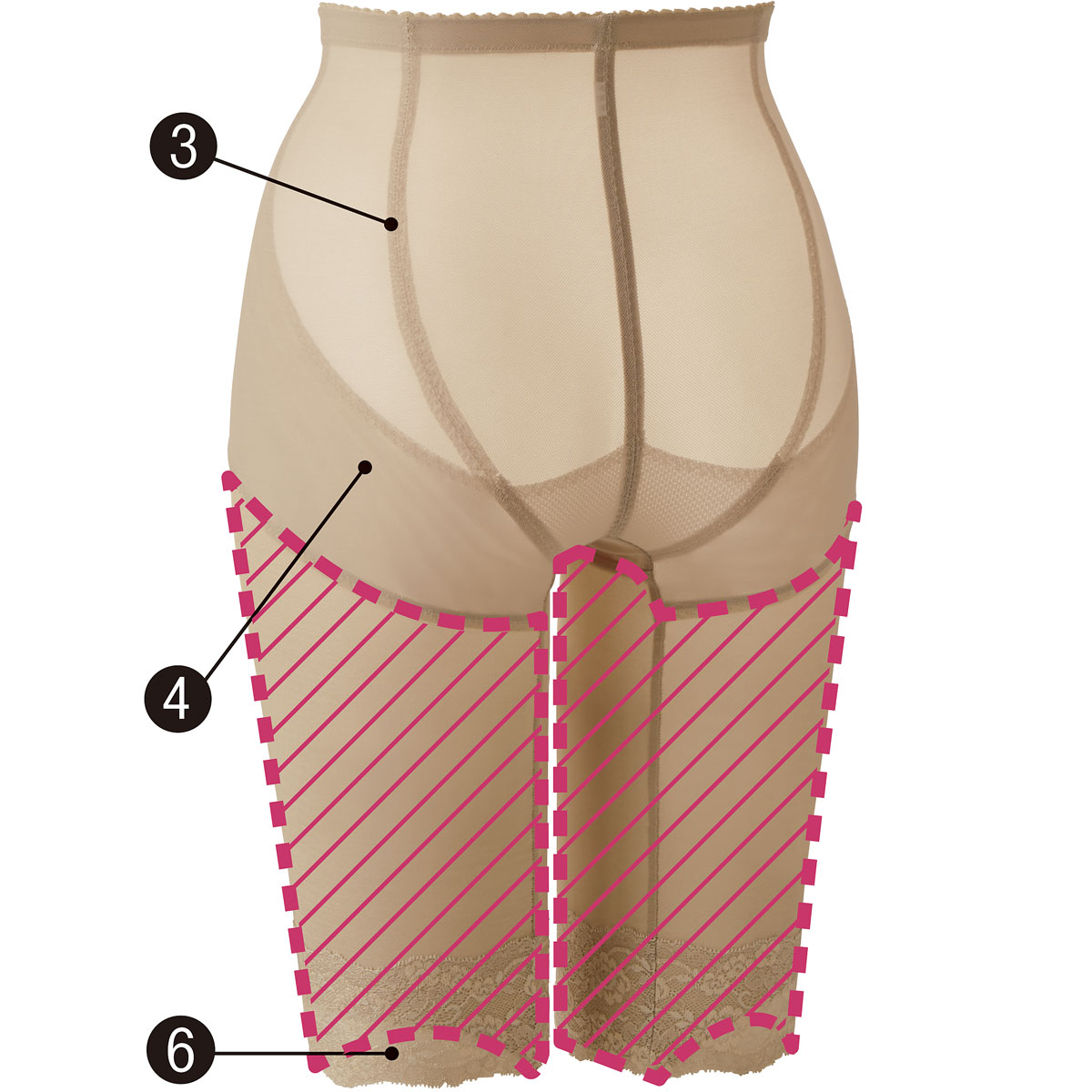 (1)お腹部分はしっかり押さえて、気になるぽっこり下腹もすっきり。(2)ハードな素材で太もも全体をがっちり補整。(5)前足口はレース+裏当てで、ひざ上のお肉をサポート。