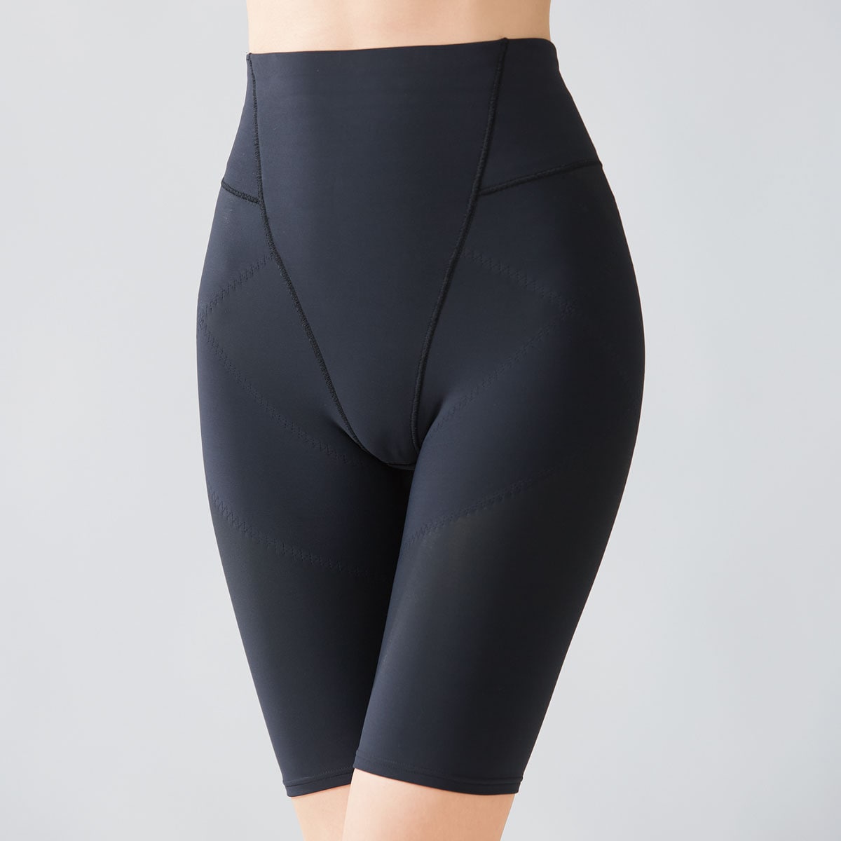 見た目は普通のレギンスだから、気軽に骨盤底筋まわりをトレーニング。スカートにもパンツにも合わせやすい5分丈。骨盤底筋まわりサポートレギンス(5分丈) ブラック 着用例(股下約20cm)