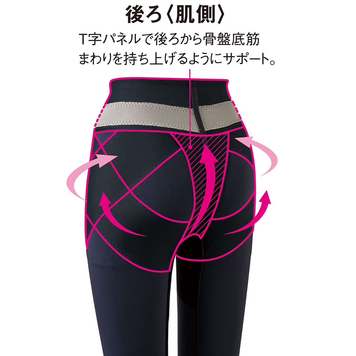 後ろ〈肌側〉 (1)T字パネルで後ろから骨盤底筋まわりを持ち上げるようにサポート。