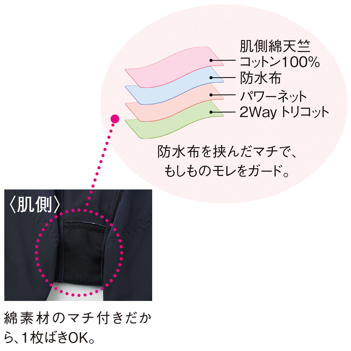 〈肌側〉綿素材のマチ付きだから、1枚ばきOK。防水布を挟んだマチで、もしものモレをガード。 (1)肌側綿天竺コットン100%(2)防水布(3)パワーネット(4)2Wayトリコット