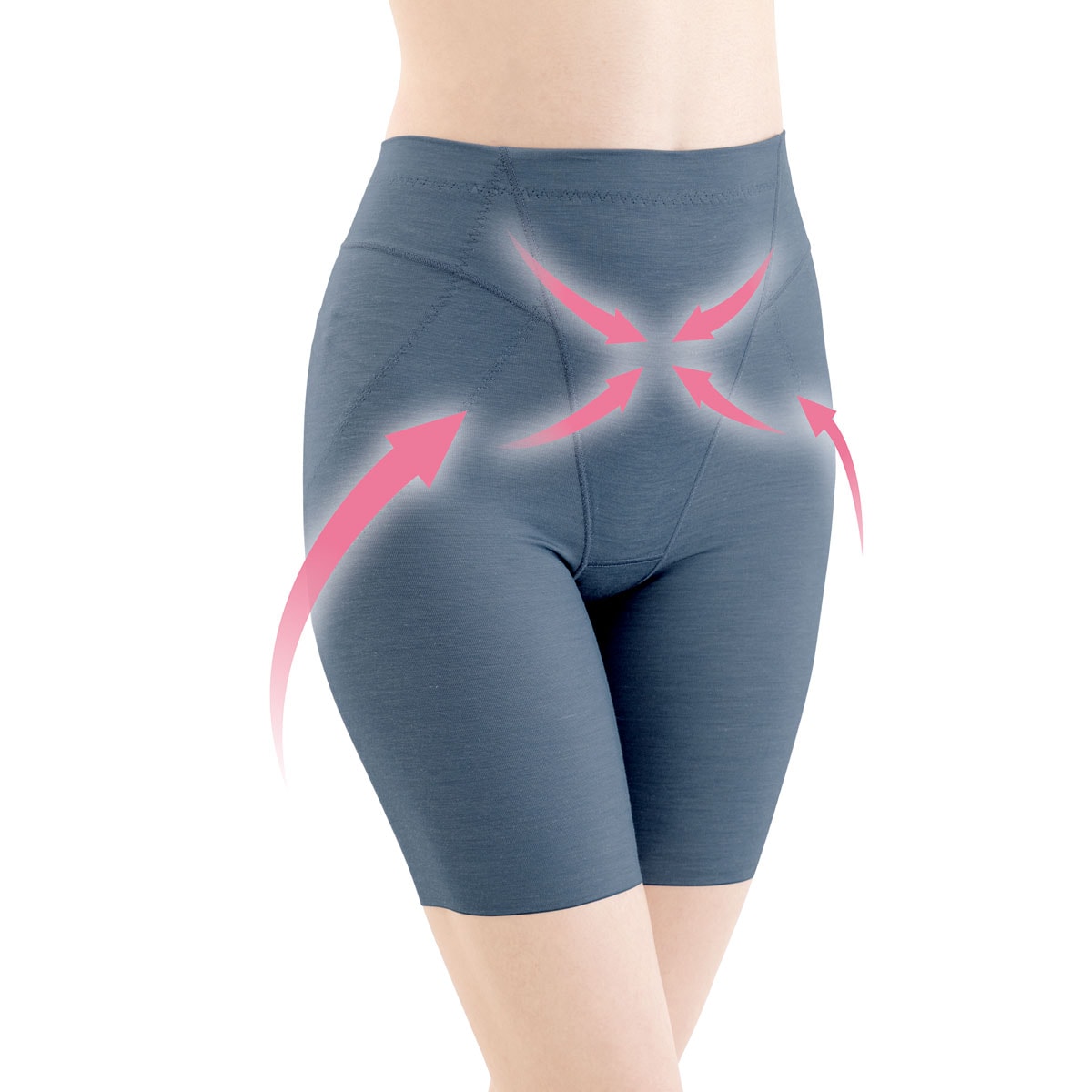 吸湿発熱綿混素材で1枚ばきも暖かく気持ちいい♪気になる部分をしっかり押さえ、ヒップライン&シルエットをすっきり!アウターにひびきにくい、足口ヘム仕上げのシンプルガードル、太ももにラインがでにくいロングタイプ。
