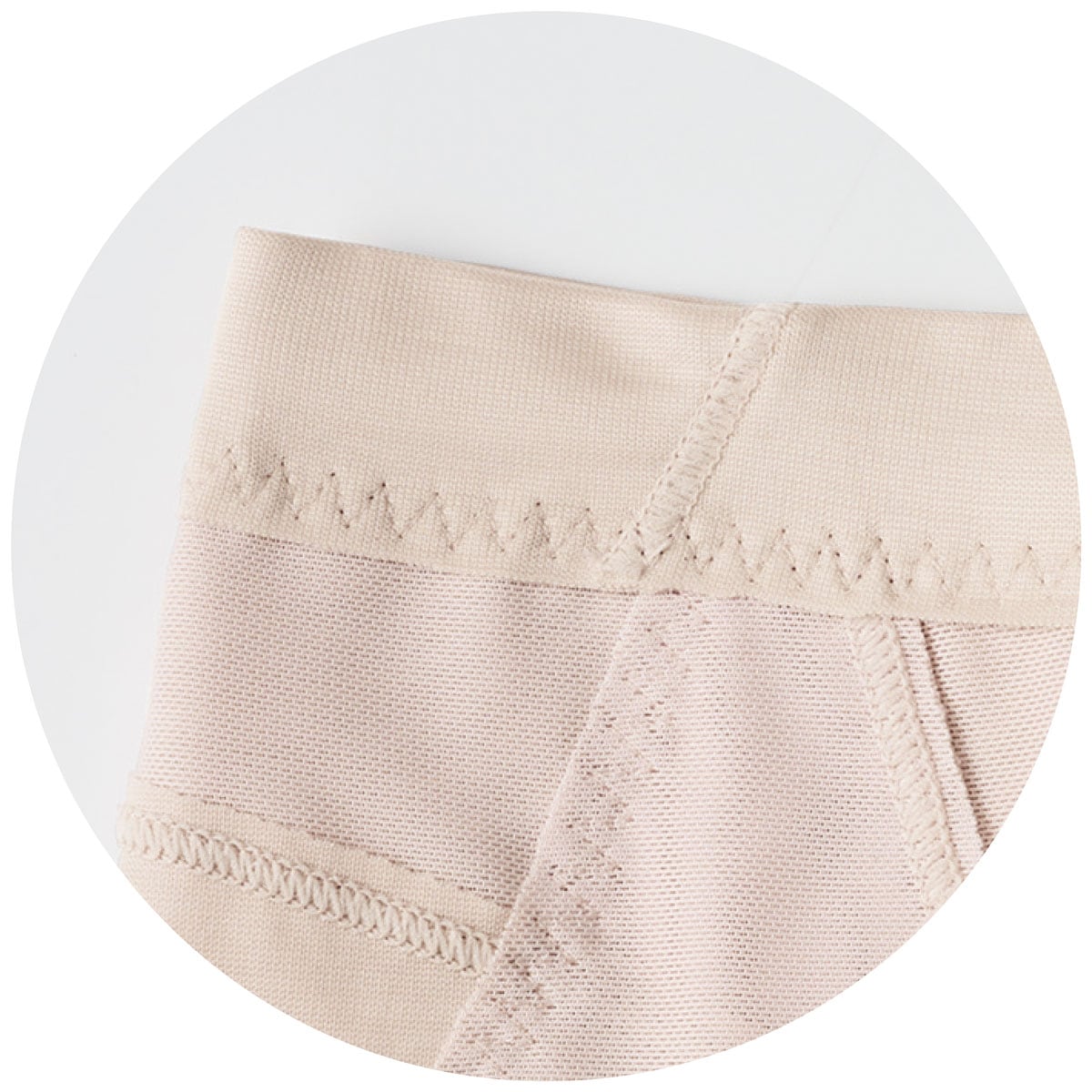 (1)くい込みにくい仕様(2)バックギャザーで丸みをつぶさずヒップメイク(3)ヒップ下から付く裏当てでヒップアップ
