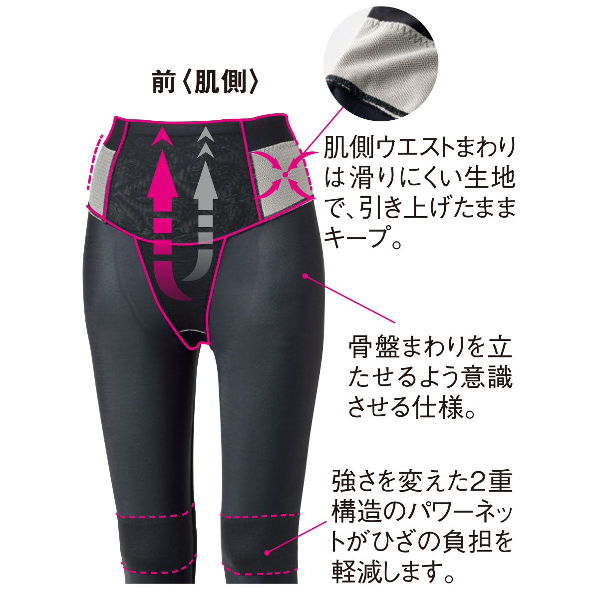 前〈肌側〉 (1)肌側ウエストまわりは滑りにくい生地で、引き上げたままキープ。(2)骨盤まわりを立たせるよう意識させる仕様。(3)強さを変えた2重構造のパワーネットがひざの負担を軽減します。