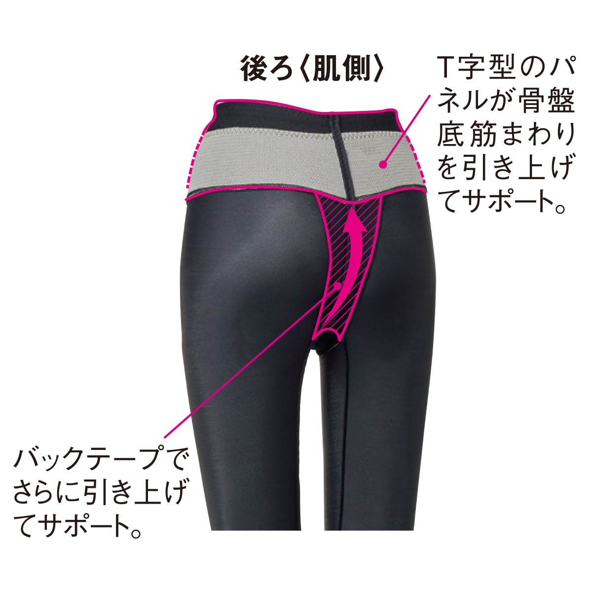 後ろ〈肌側〉 (1)T字型のパネルが骨盤底筋まわりを引き上げてサポート。(2)バックテープでさらに引き上げてサポート。