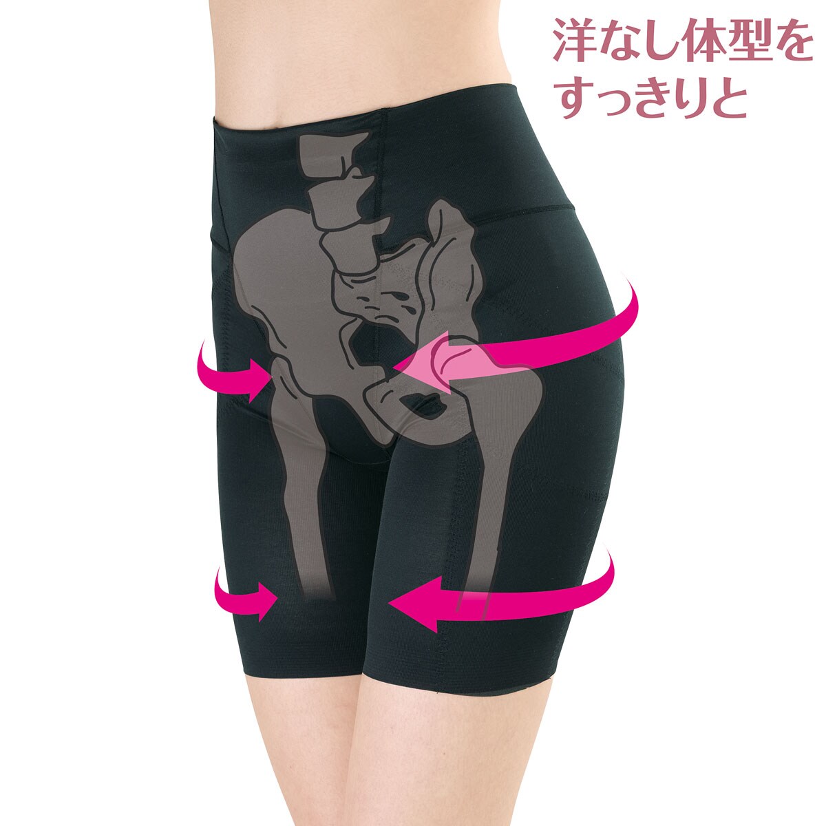 骨盤まわりを整えて大転子の張り出しを抑えて下半身をすっきり見せ。※骨格のイラストはイメージです。