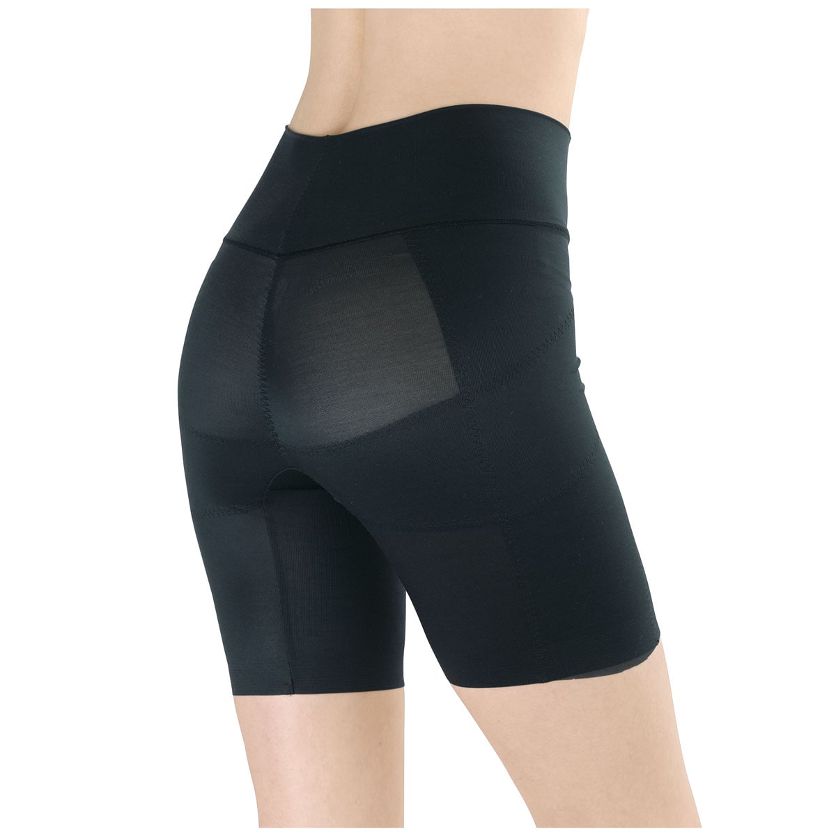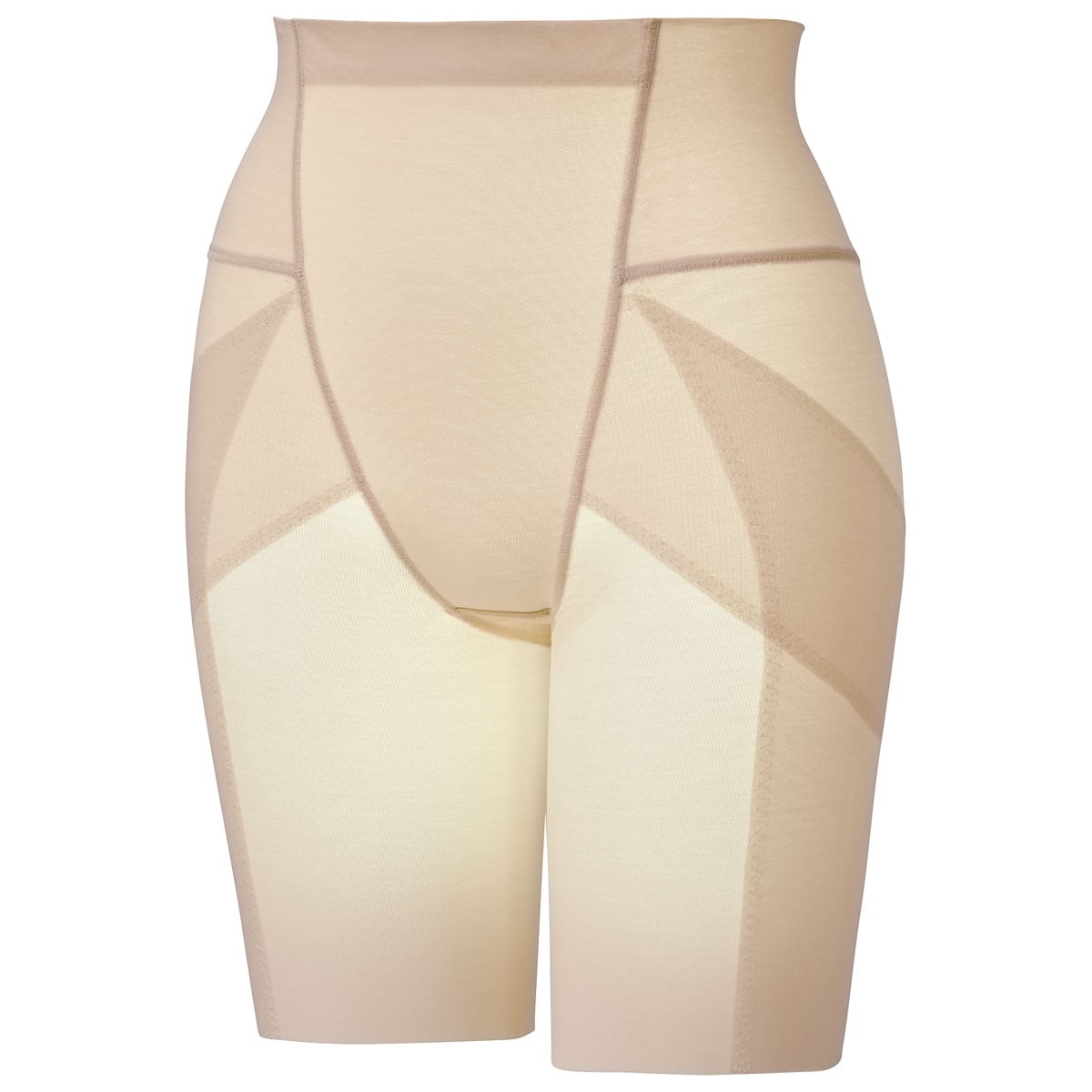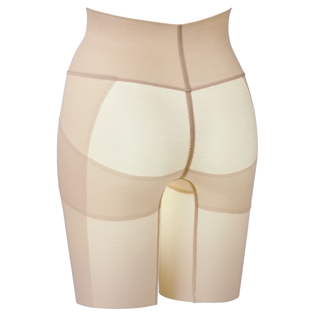 (1)大転子部分は身生地+2重のパワーネットで広がりをおさえる。(2)ハリが気になる太ももはパワーネットでサポート。(3)綿混のヘム仕様で肌あたりがなめらか。(4)ウエスト近くまで身生地2重仕様でお腹をシェイプ。(5)折り返し仕様でくい込みにくい。