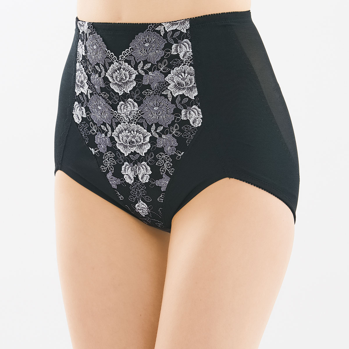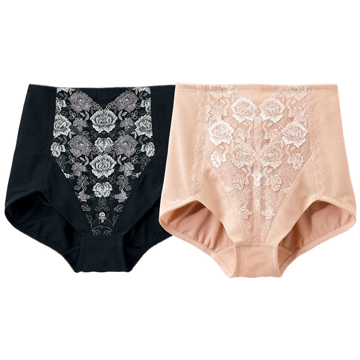 パワフルな補整力でシルエットがすっきり変わる、ハードタイプのショートガードル(色違い2枚組)。締め付けハードなガードルをお探しの方におすすめです。フロントはパワーネットの裏当てでお腹すっきり。お尻は立体パターンで丸みをつぶさず、下からぐぐっとヒップアップ。足口にはゴムを使わず、締め付け感を軽減しました。花柄レースをあしらったフェミニンなデザインです。