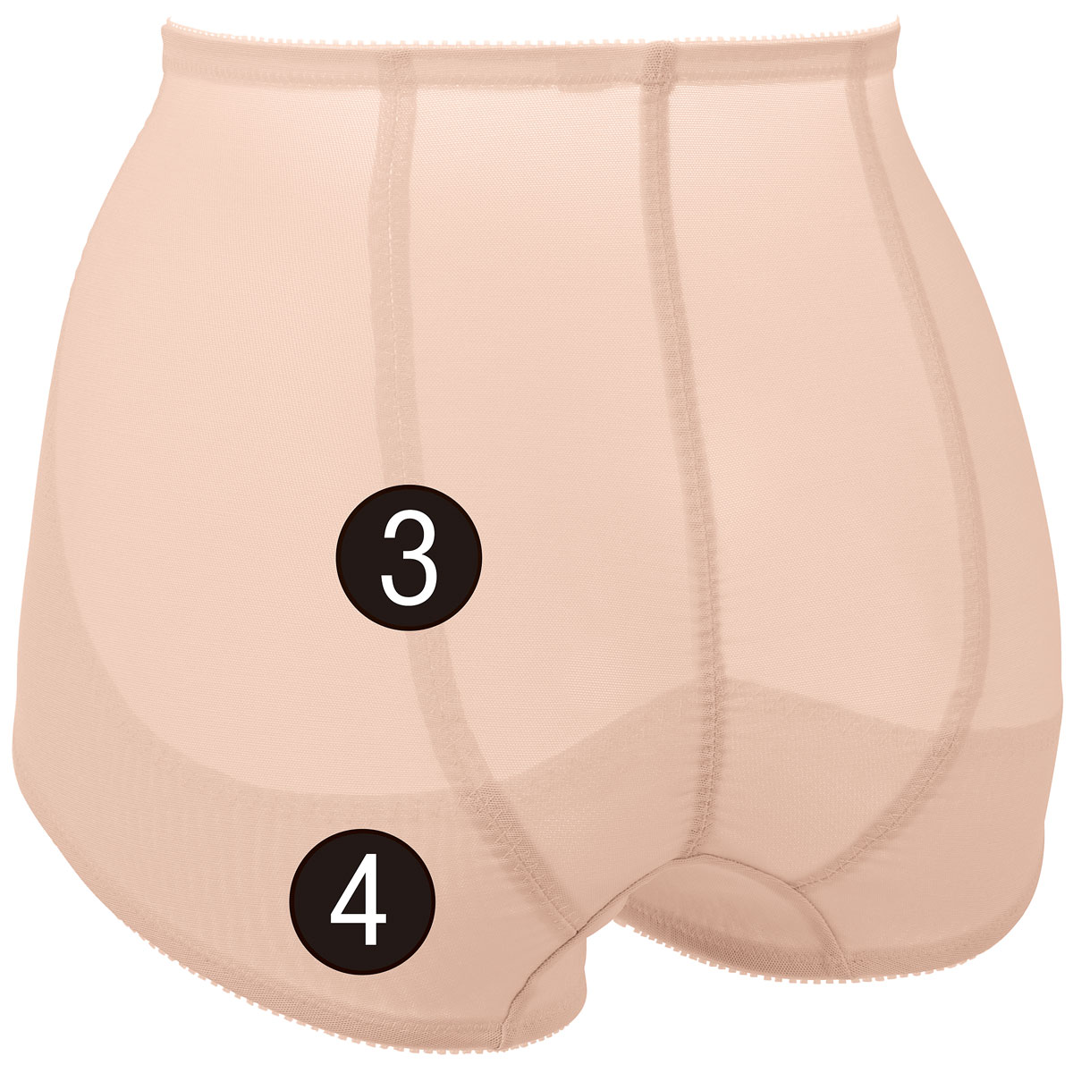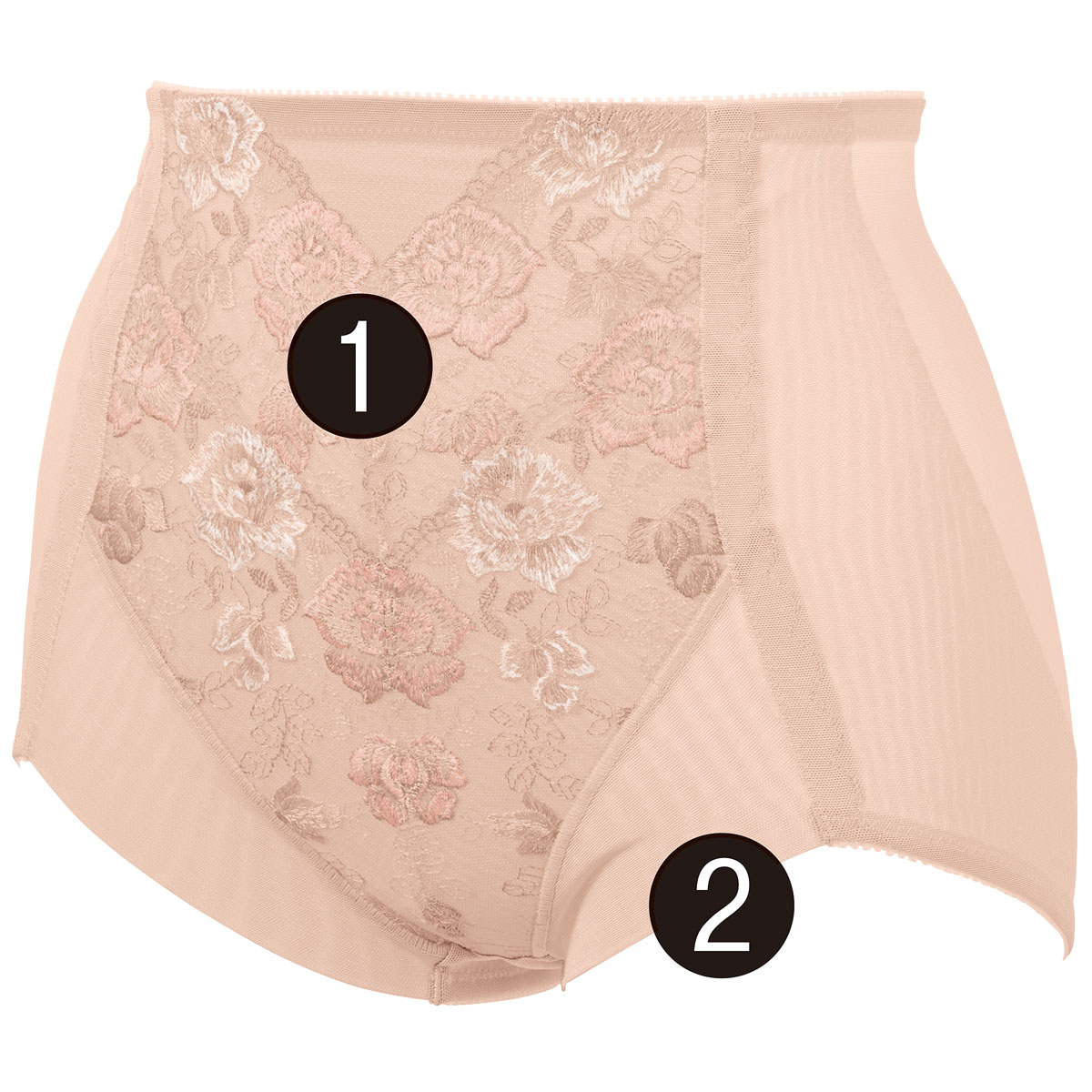 (1)裏当てを付け、おなかをしっかり引き締めます。(2)そけい部はゴムを使わず、締め付け感を軽減。