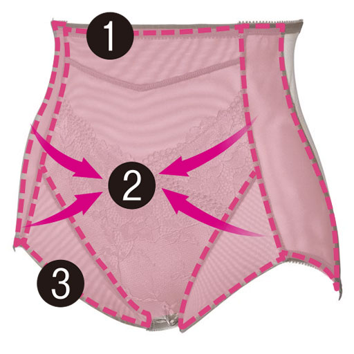 (1)フロントウエストゴムは身生地くるみ仕様でくい込みにくい。(2)パワーネット2重でお腹をシェイプ。(3)前足口はゴム不使用でくい込み軽減。