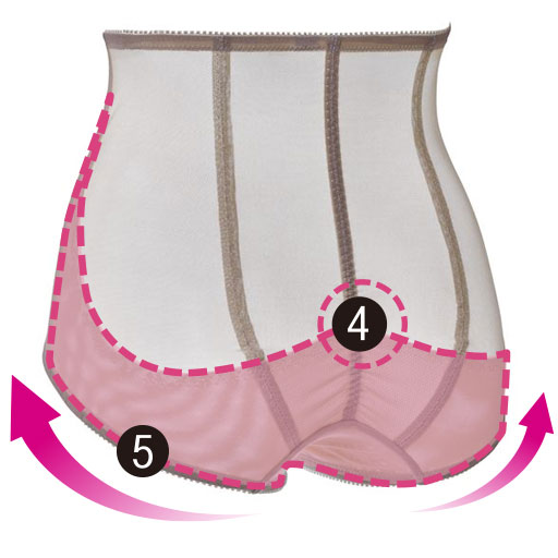 (4)立体パターンで美尻をメイク。(5)裏当てでヒップをぐっと持ち上げる。