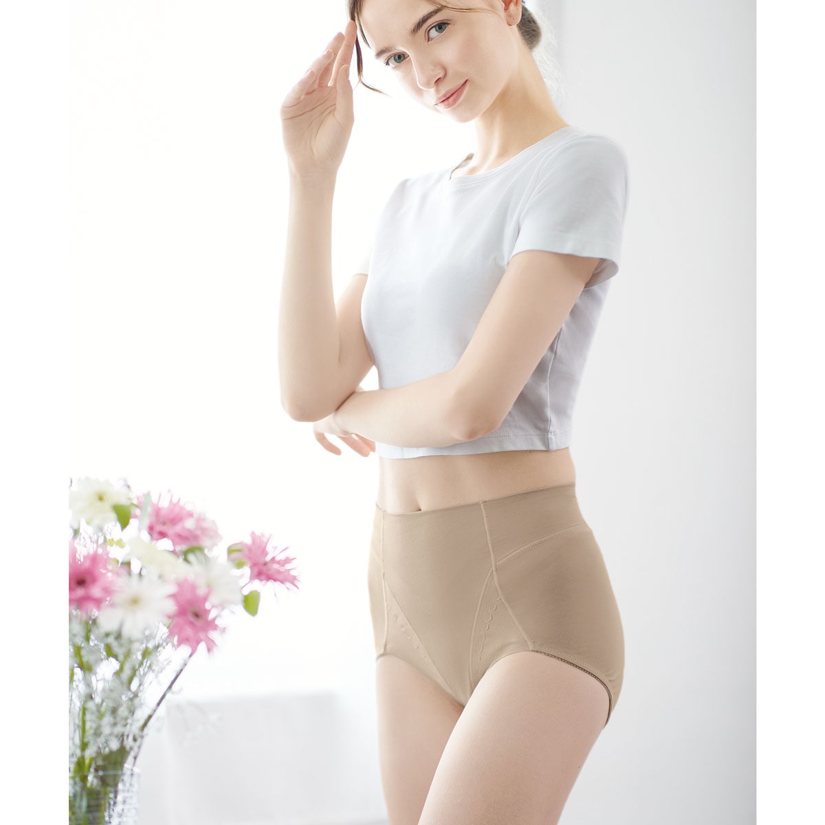 ソフトな裏当てでおなかをやさしく押さえてすっきり、身生地綿90%素材で肌ざわりもやさしく毎日続けられる着用感で人気のGS-233のリニューアル版。ウエストはゴムを使わずくい込みにくく楽な着け心地。そけい部も生地の折り返し仕様でやさしくフィット。1枚からご購入いただけます。