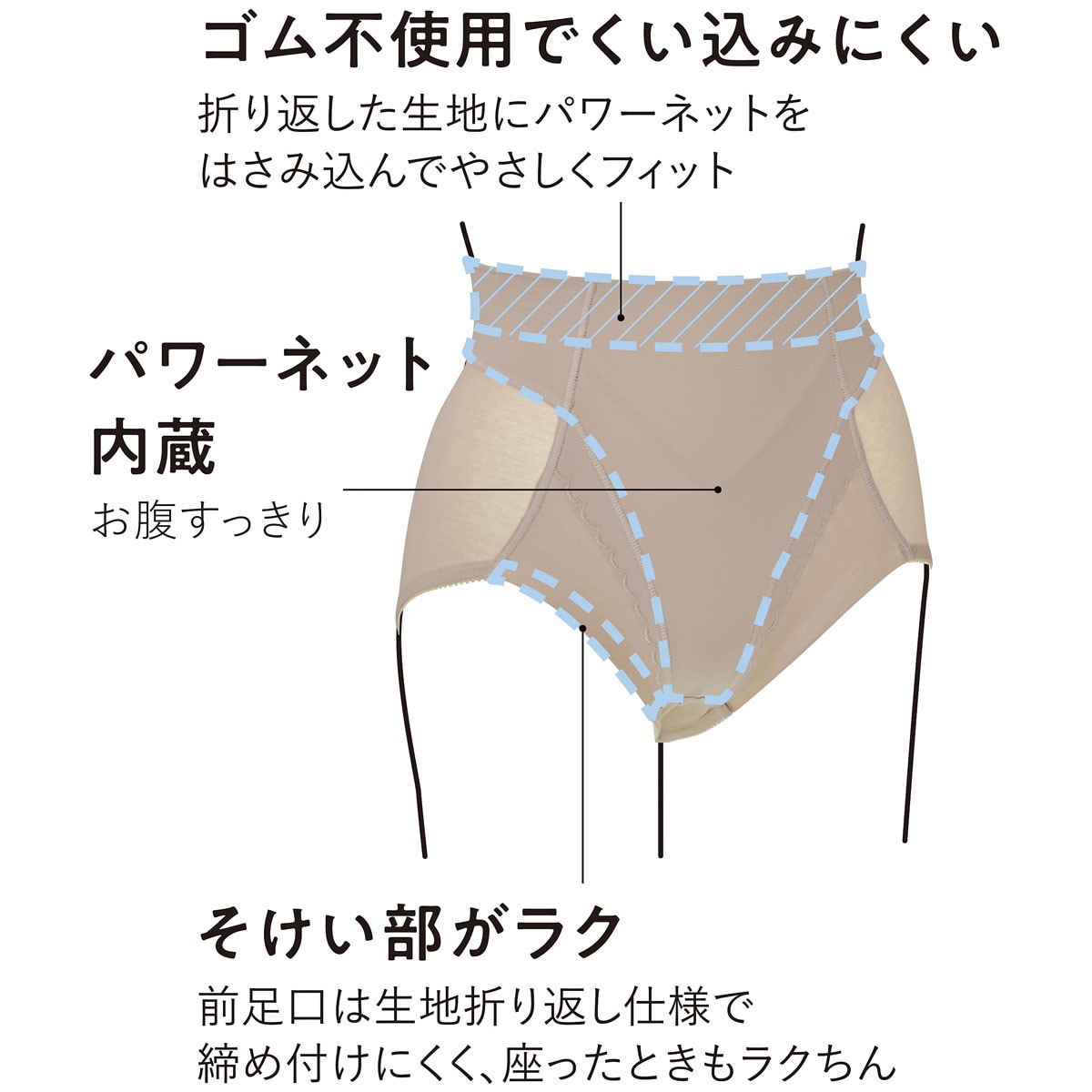 そけい部がラク 前足口は生地折り返し仕様で締め付けにくく、座ったときもラクちん (1)ゴム不使用でくい込みにくい 折り返した生地にパワーネットをはさみ込んでやさしくフィット(2)パワーネット内蔵 お腹すっきり