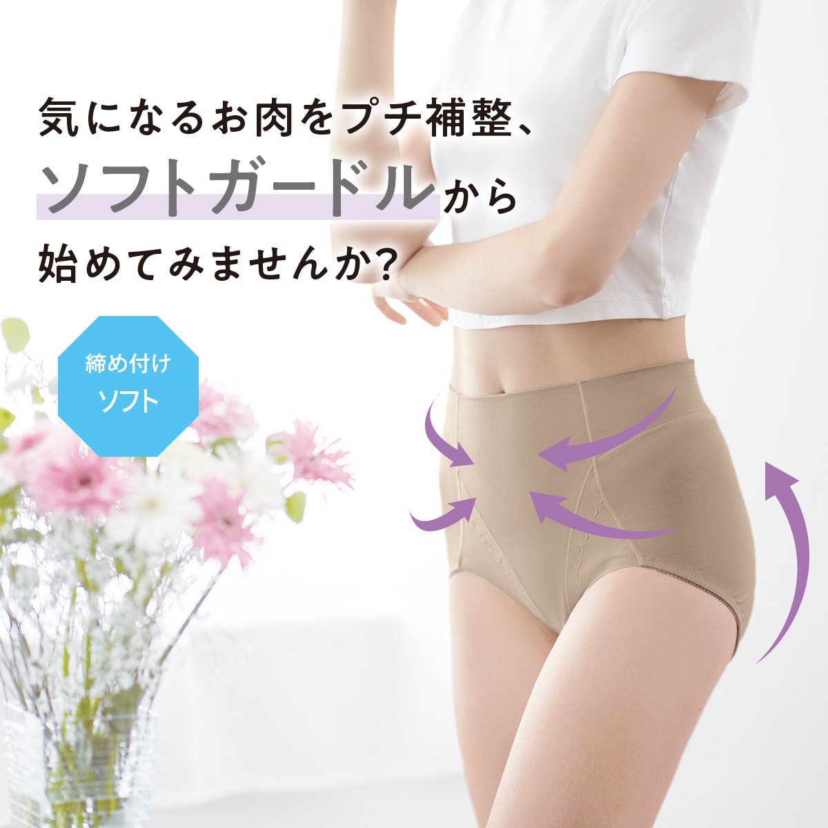 ソフトな裏当てでおなかをやさしく押さえてすっきり、身生地綿90%素材で肌ざわりもやさしく毎日続けられる着用感で人気のGS-233のリニューアル版。1枚からご購入いただけます。