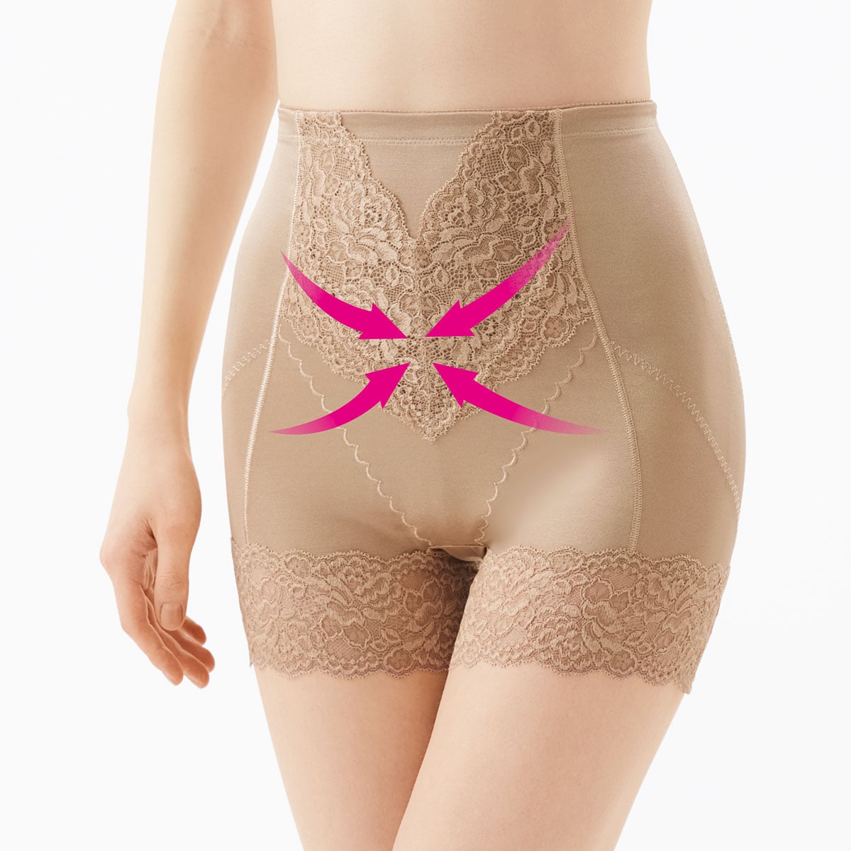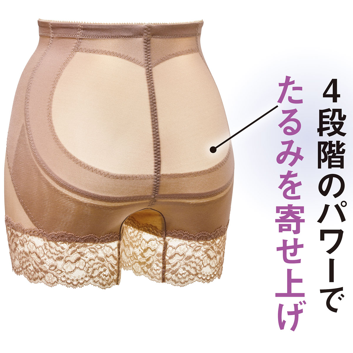 足口レース仕様でくい込みにくく段差になりにくい。4段階の切り替えパワーでたるんだヒップをぐっと寄せ上げます。