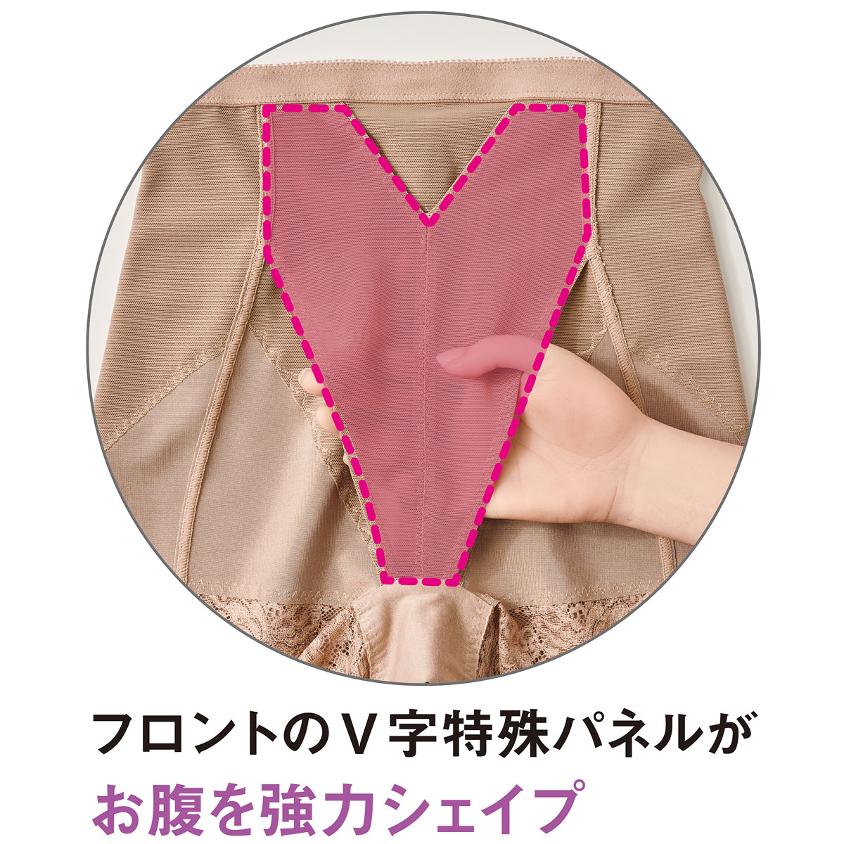 左右を縫い付けない仕様のV字特殊パネルがしっかりお腹をおさえます。