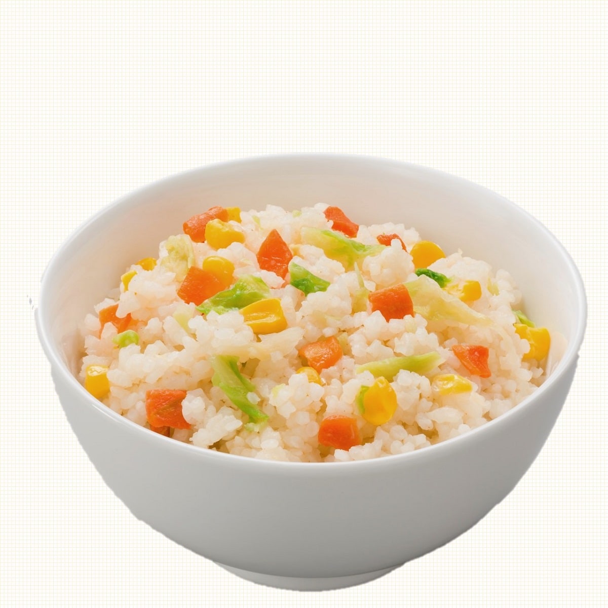 野菜ピラフ優しい色合いの野菜ピラフでほんのり甘く、食べやすいごはんです。