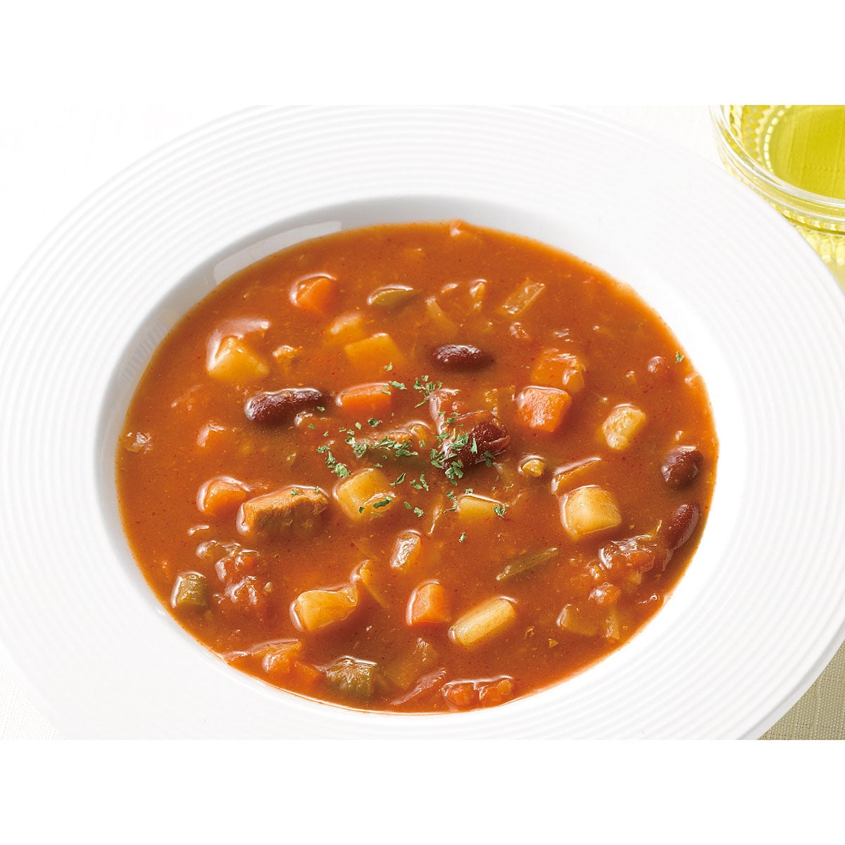 ■内容量/150g×8袋 ■原材料/野菜(じゃがいも、玉葱、キャベツ、人参、さやいんげん)、トマト・ピューレーづけ(イタリア製造)、トマトピューレー、鶏肉、トマトペースト、赤いんげん豆、ソテーオニオン、大豆油、オリーブオイル、食塩、チキンエキスパウダー、砂糖、米糖化調味料、昆布エキス、香辛料/増粘剤(加工澱粉、キサンタン)※原材料の一部に大豆・鶏肉が含まれます。※商品の特性上、返品・交換はお受けできません