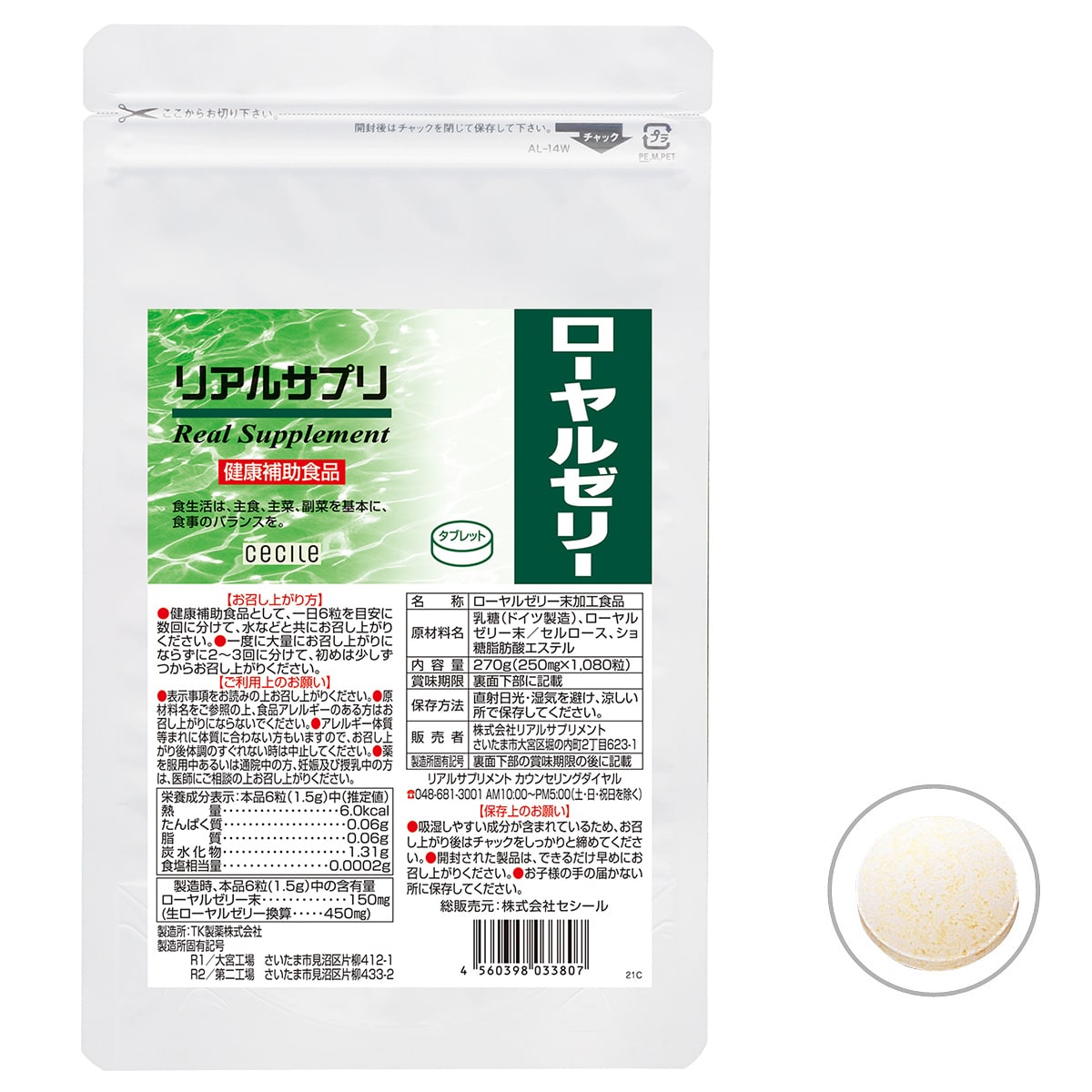 ■内容量M:250mg×180粒(約30日分)LL:250mg×1080粒(約180日分)●1日の目安/6粒●主要成分(6粒当たり)/ローヤルゼリー末 150mg(生ローヤルゼリー換算 450mg)※原材料の一部に乳が含まれます。●原材料/乳糖(ドイツ製造)、ローヤルゼリー末/セルロース、ショ糖脂肪酸エステルリアルサプリ・リアルエクセレントシリーズはすべて国内工場で製造しております。※商品の特性上、返品・交換はお受けできません。