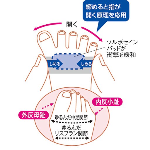 締めると指が開く原理を応用し、横アーチを補整。※イメージ