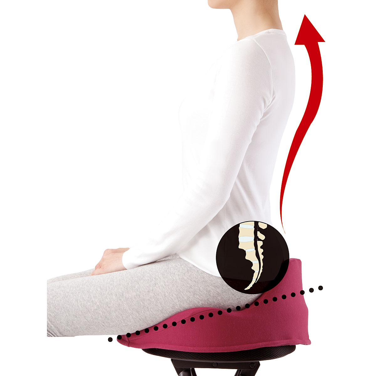 仙骨から立ち上げることで姿勢を楽にし、体への負担を軽減。心身共に快適で健やかな生活に!!人間工学に基づいた傾斜で骨盤の中心にある仙骨を立ち上げ、背骨のS字カーブを作ります。さらに高反発ウレタンフォームと3D立体形状が骨盤全体を包み込み、腰への負担を軽くします。リビングで、オフィスで、床置きで!
