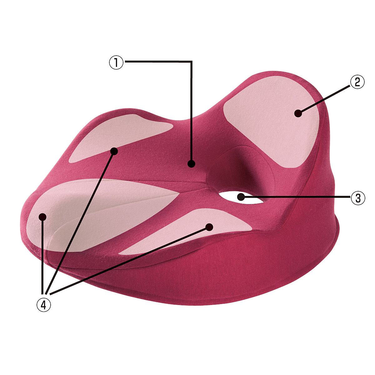 (1)仙骨を立ち上げる傾斜…仙骨起立傾斜で骨盤を平行にし、仙骨を立ち上げる。背骨の自然なS字カーブを作ることで正しい姿勢へ。(2)仙骨サポート…仙骨ホルダー部で立ち上げた仙骨をしっかりサポート。姿勢をキープ。(3)座面ホール…尾骨への圧迫を防ぎ、耐圧をより広い範囲で分散することで腰への負担を軽減。(4)骨盤サポート…骨盤を包み込む3D立体形状で腰回りをホールド。※色付き部分はサポートイメージ
