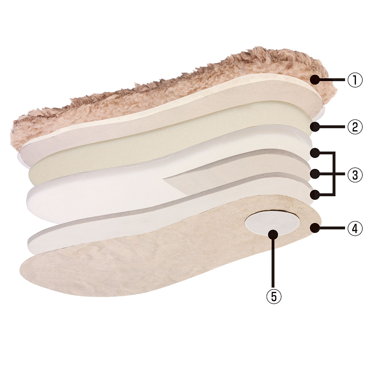 底面は多層構造で底冷え・衝撃をカバー!(1)極暖生地(2)低反発ウレタン(3)3層のEVA(4)ポリスエード生地(5)すべり止め(豚皮)※イメージ