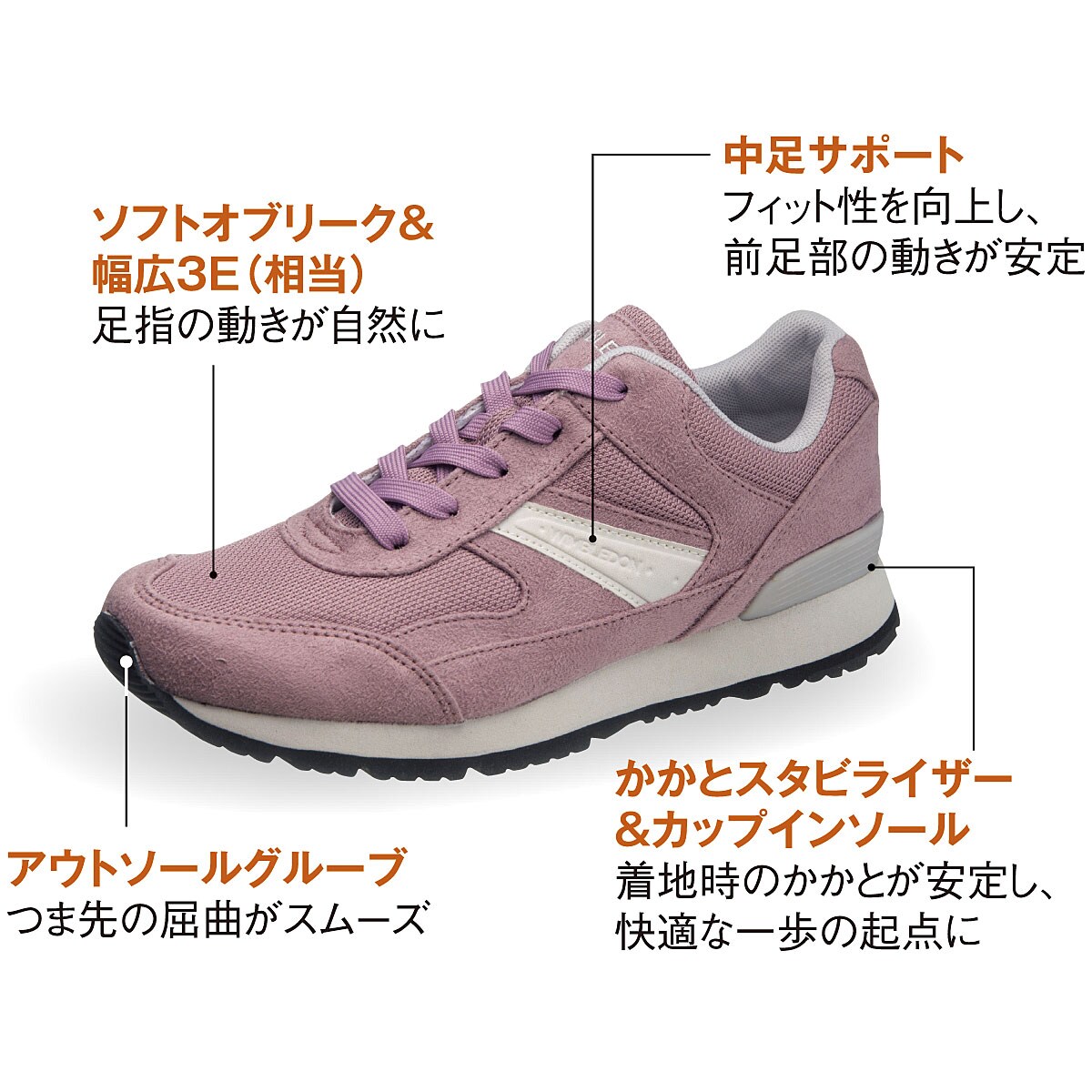 ー足にやさしいこだわりの機能ー・ソフトオブリーク&幅広3E相当…足指の動きが自然に。・中足サポート…フィット性を向上し、前足部の動きが安定。・アウトソールグルーブ…つま先の屈曲がスムーズ。・かかとスタビライザー&カップインソール…着地時のかかとが安定し、快適な一歩の起点に。■素材/[甲材]合成皮革 [底材]合成底 ■ヒール高/約3cm ■重量/約220g(23cm片足) ■ワイズ/3E相当 ▼規格変更などにより、素材の色味が多少異なる場合がございます。●中国製※靴の試し履きは必ず室内でお願いします。一度ご使用になられた靴の交換、返品は承れません。※雨の日や水に濡れた路面・床面でご使用の場合には、スリップや転倒の危険がありますので、歩行の際には十分ご注意ください。