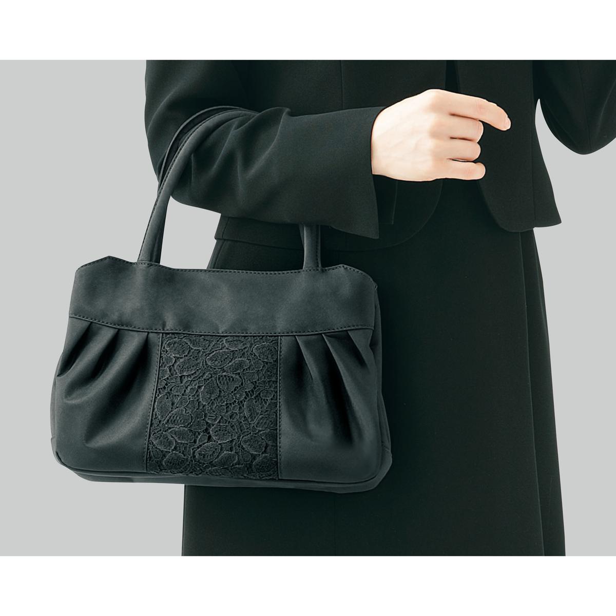 ~一般社団法人 日本フォーマル協会認定フォーマルスペシャリスト 足立 治美さん~弔事のマナーでは、飾りや光沢のあるものは避け、布製のシンプルな装いがおすすめです。※コメントは個人の見解です。【軽量約260g】【はっ水】■素材/[本体]表地・裏地:ポリエステル [レース部]綿、ナイロン、レーヨン ■サイズ(約cm)/縦20(持ち手含む35)×横28×マチ11 ■重量/約260g ■仕様/ダブルファスナー式開閉、あおりオープンポケット×2、オープンポケット(内側)×2、ファスナーポケット(内側)×1●中国製