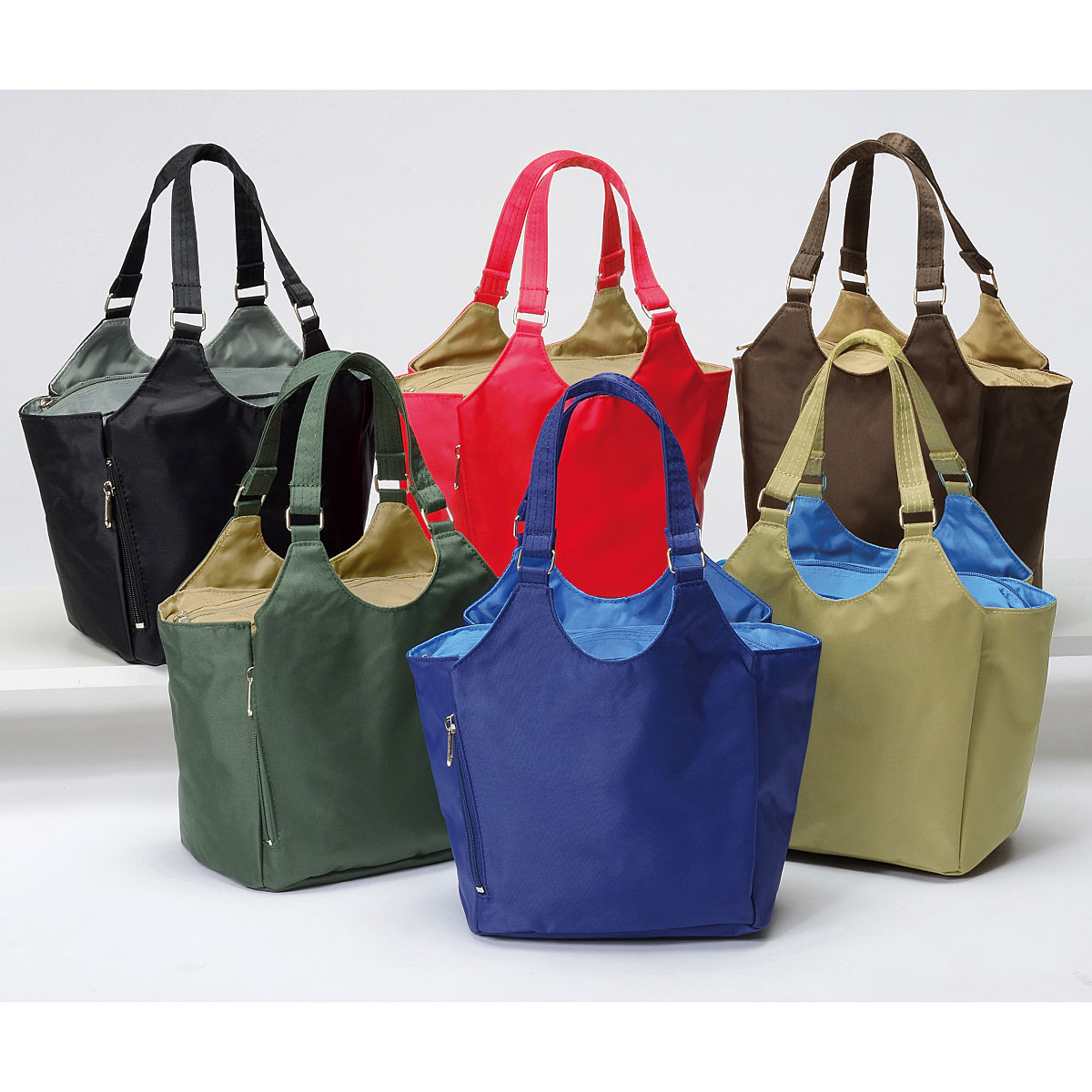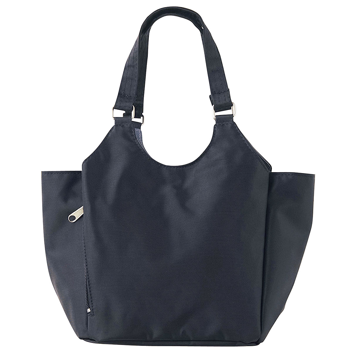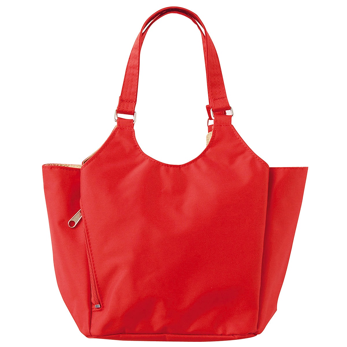 ■素材/ナイロン100% ■サイズ(約cm)/[本体]縦20×横31×マチ13 [持ち手高さ]16 ■重量/約230g ■仕様/[開閉]中央部ファスナー式 [外側]マグネットホック付あおりポケット×2、縦ファスナーポケット×1、ファスナーポケット×1 [内側]オープンポケット×1●中国製